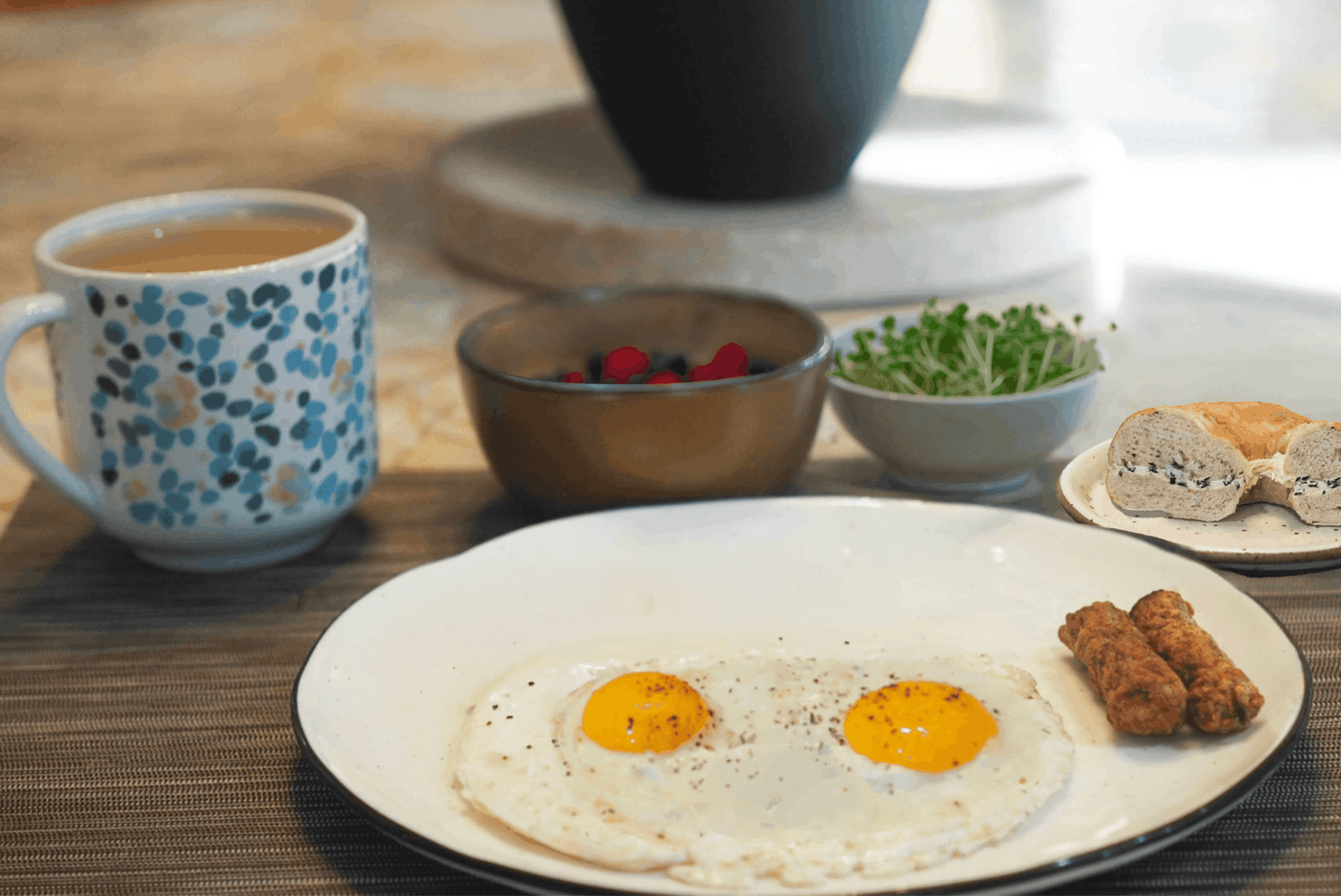 - Serve the 1/2 bagel with eggs, chicken sausage, microgreens, berries, and coffee.