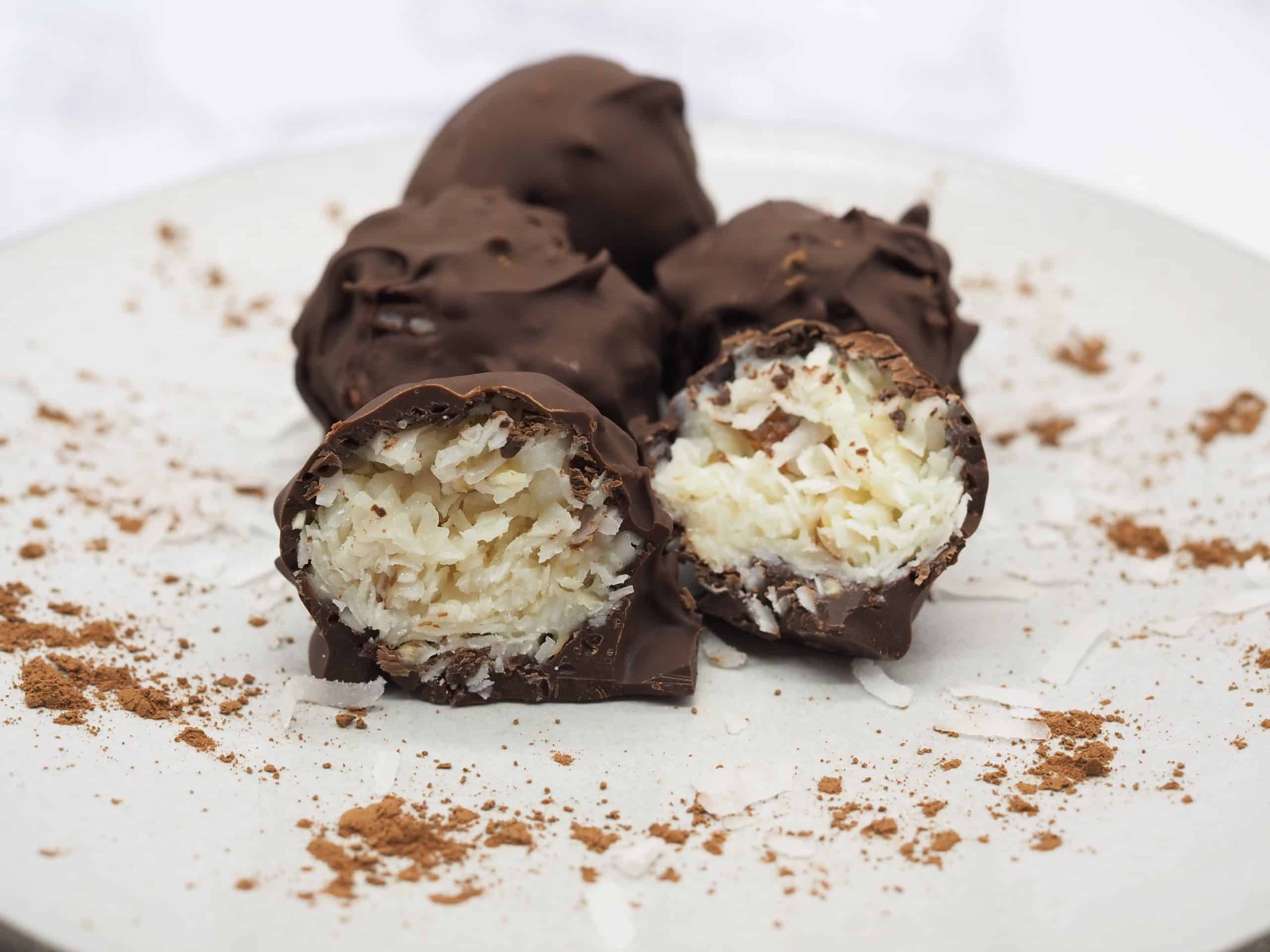 - In 20 second increments, melt the chocolate in the microwave, stirring each time until smooth. Using a fork, dip each coconut ball into the chocolate, let the excess drip off and place back on the parchment paper. Refrigerate for 10 to 15 minutes for the chocolate to cool and harden before serving.