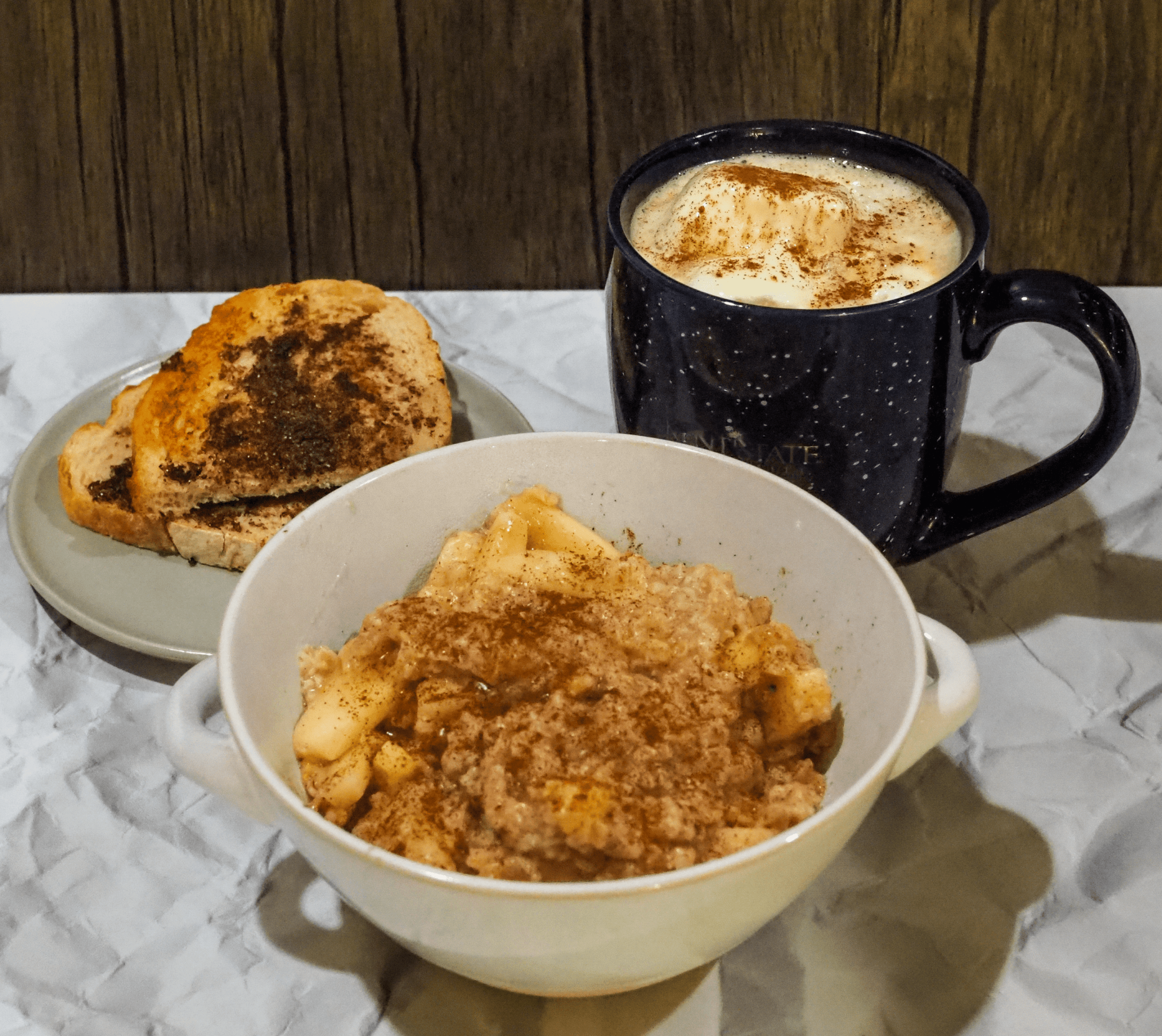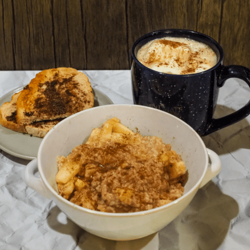 - Portion the oatmeal into bowls, and pour milk over the top. Serve with cinnamon sugar toast, a latte topped with whipped cream, and a sprinkle of pumpkin spice.