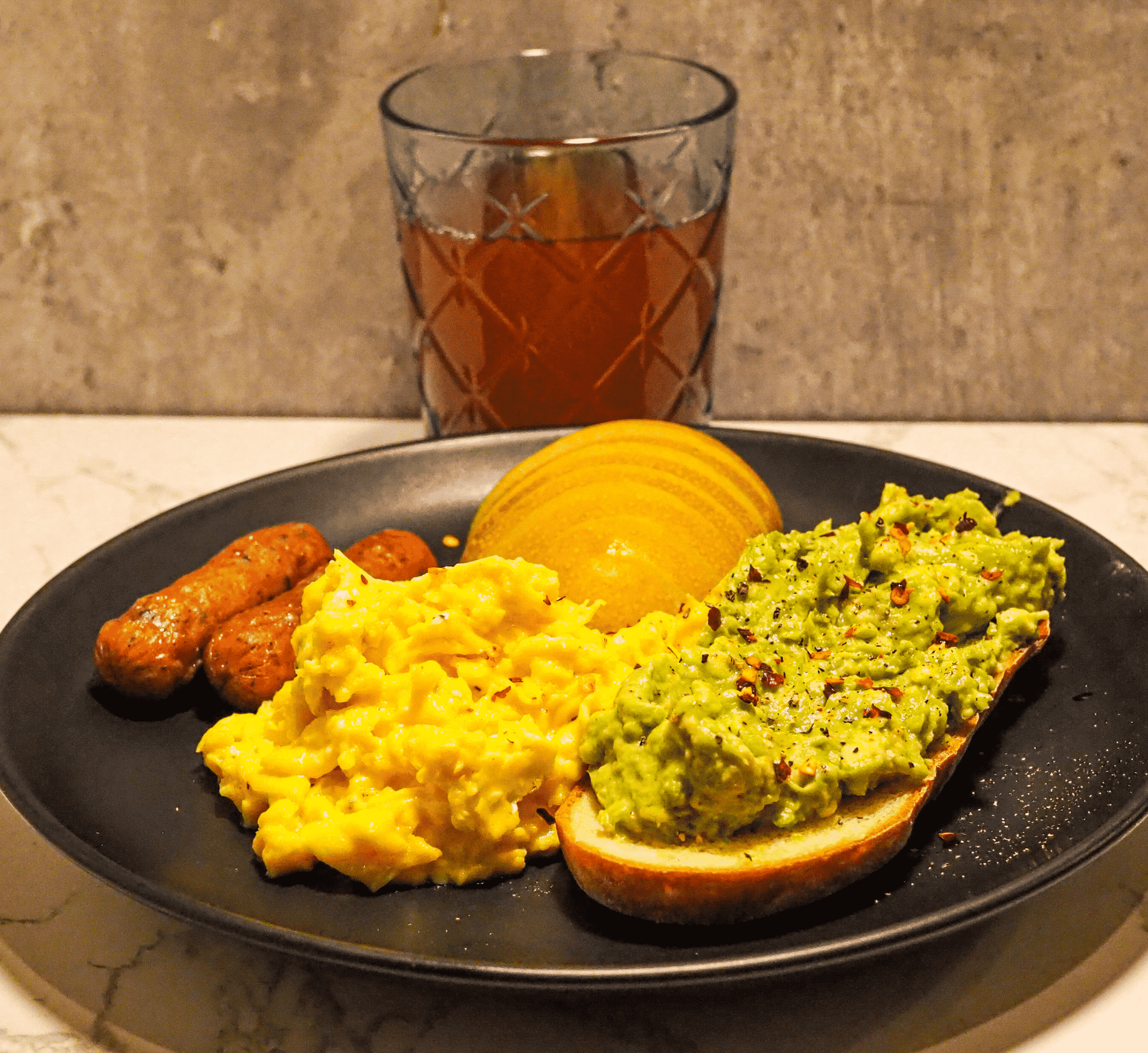 - Serve the eggs with avocado toast, chicken sausage, and pear.