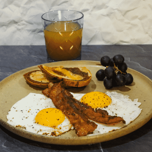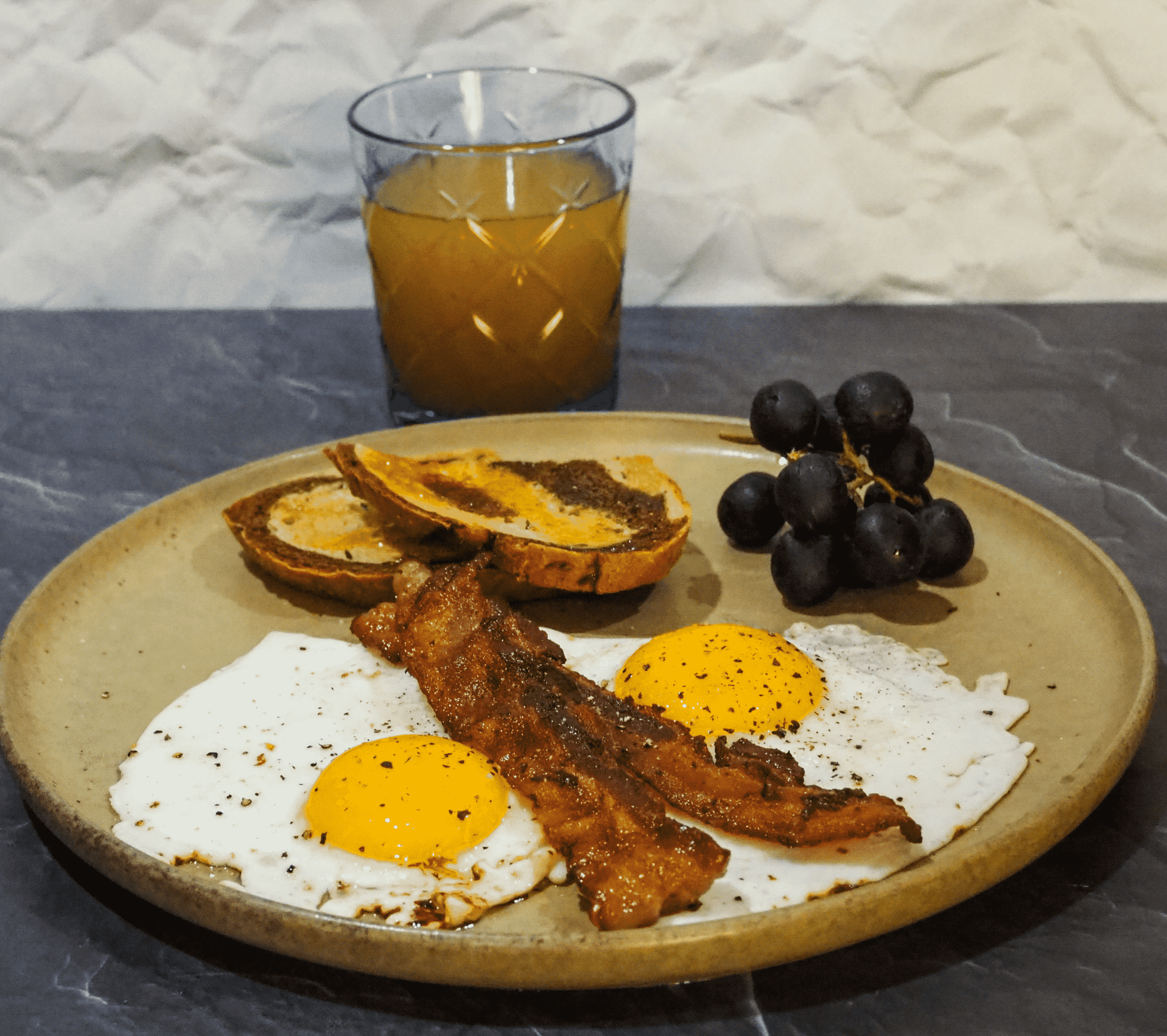 - Serve the eggs with bacon. Season with salt and pepper. Serve with toast and grapes.