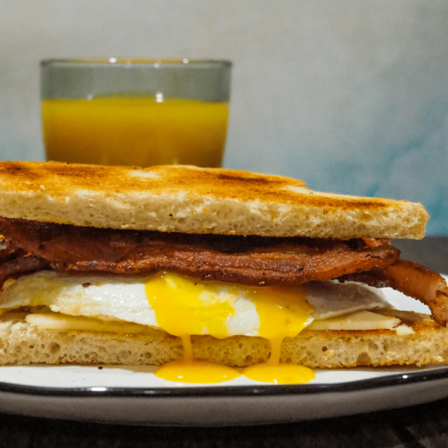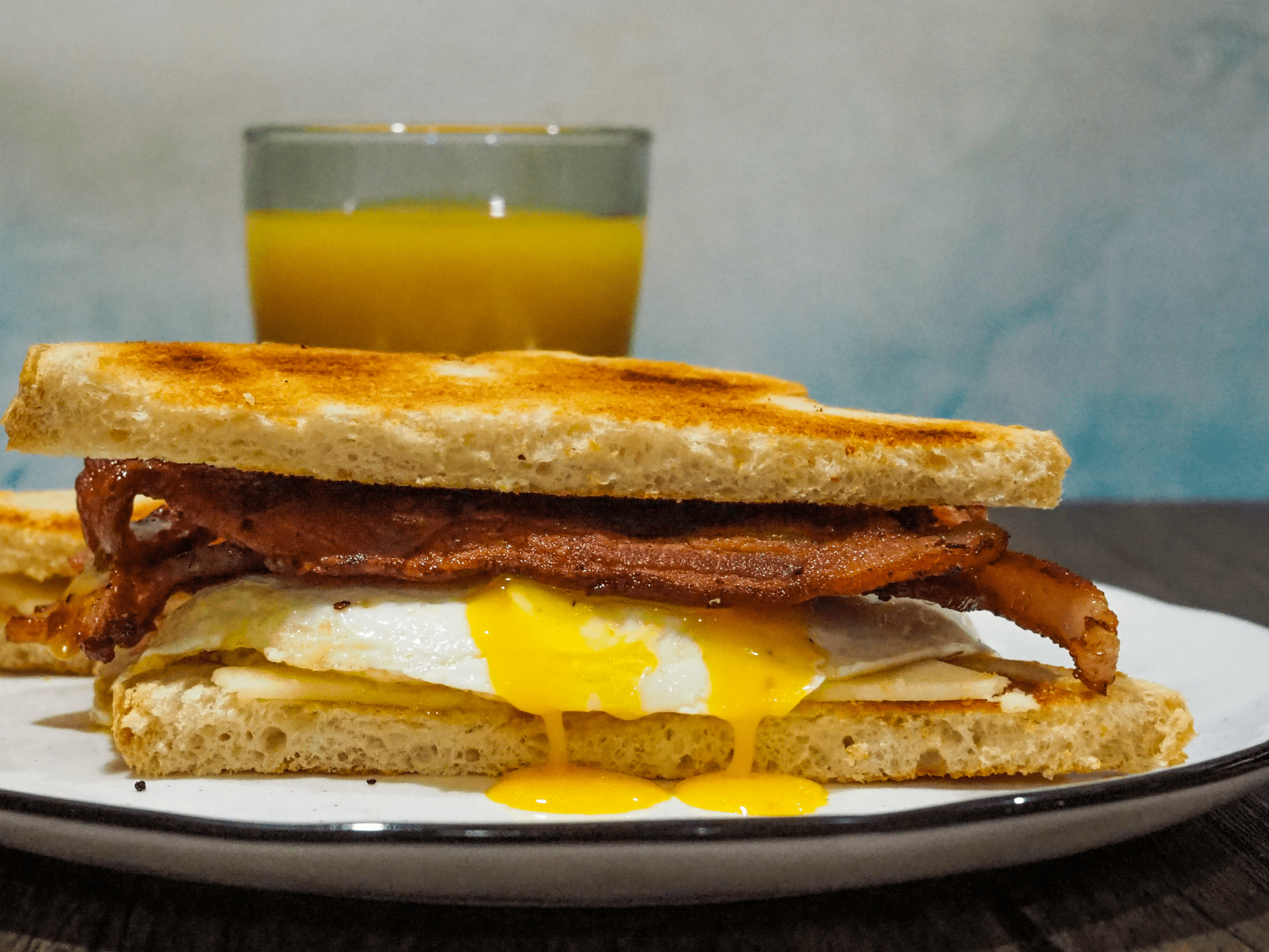 • Toast the bread. Arrange the bacon and eggs onto the bread and cut sandwiches in half.