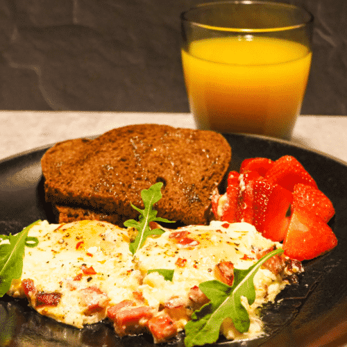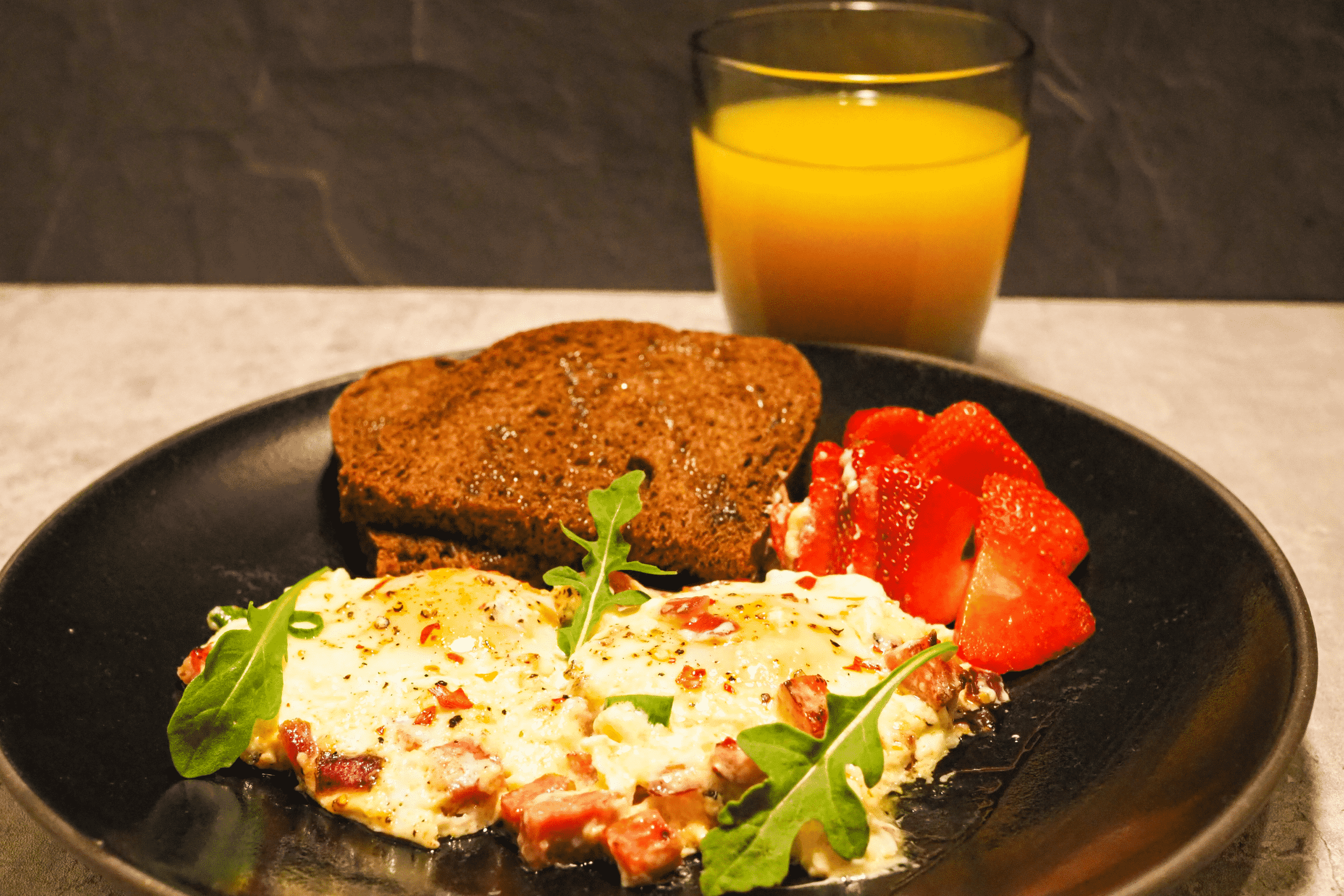 - Portion, drizzle with a little olive oil, serve with toast and strawberries.