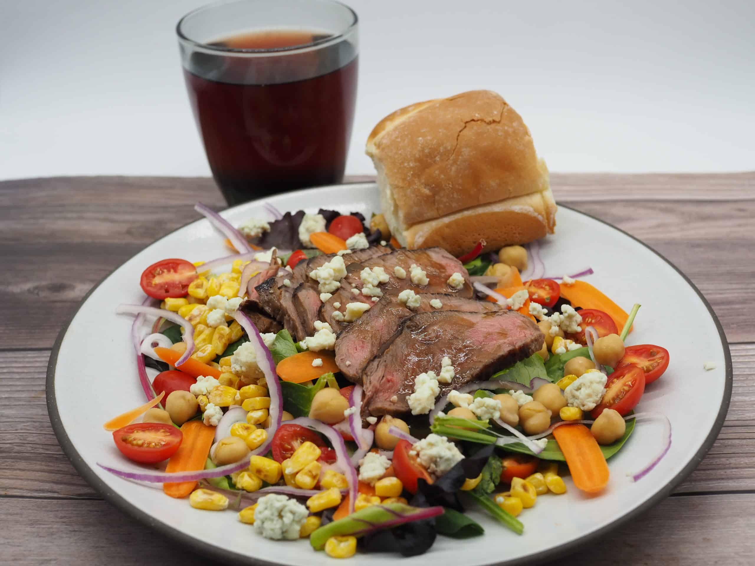 - Lay down the spring mix, top with tomatoes, corn, chickpeas, carrots, onion, sliced steak, and blue cheese.