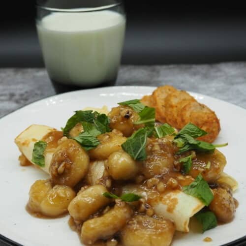 • In a non-stick pan, melt the butter over medium heat. Add in the banana, walnuts, brown sugar, vanilla, and a pinch of cinnamon. Cook until the mixture turns to a thick syrup and the bananas soften then set aside.