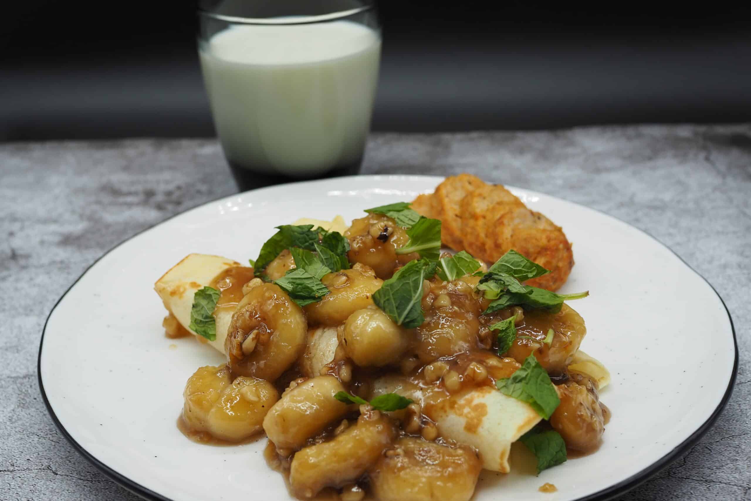 • In a non-stick pan, melt the butter over medium heat. Add in the banana, walnuts, brown sugar, vanilla, and a pinch of cinnamon. Cook until the mixture turns to a thick syrup and the bananas soften then set aside.