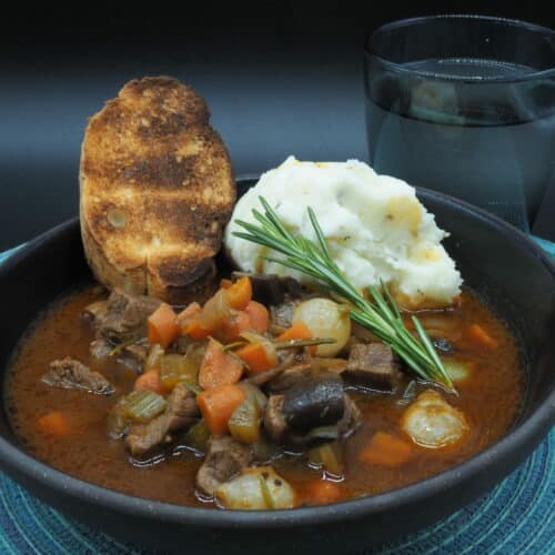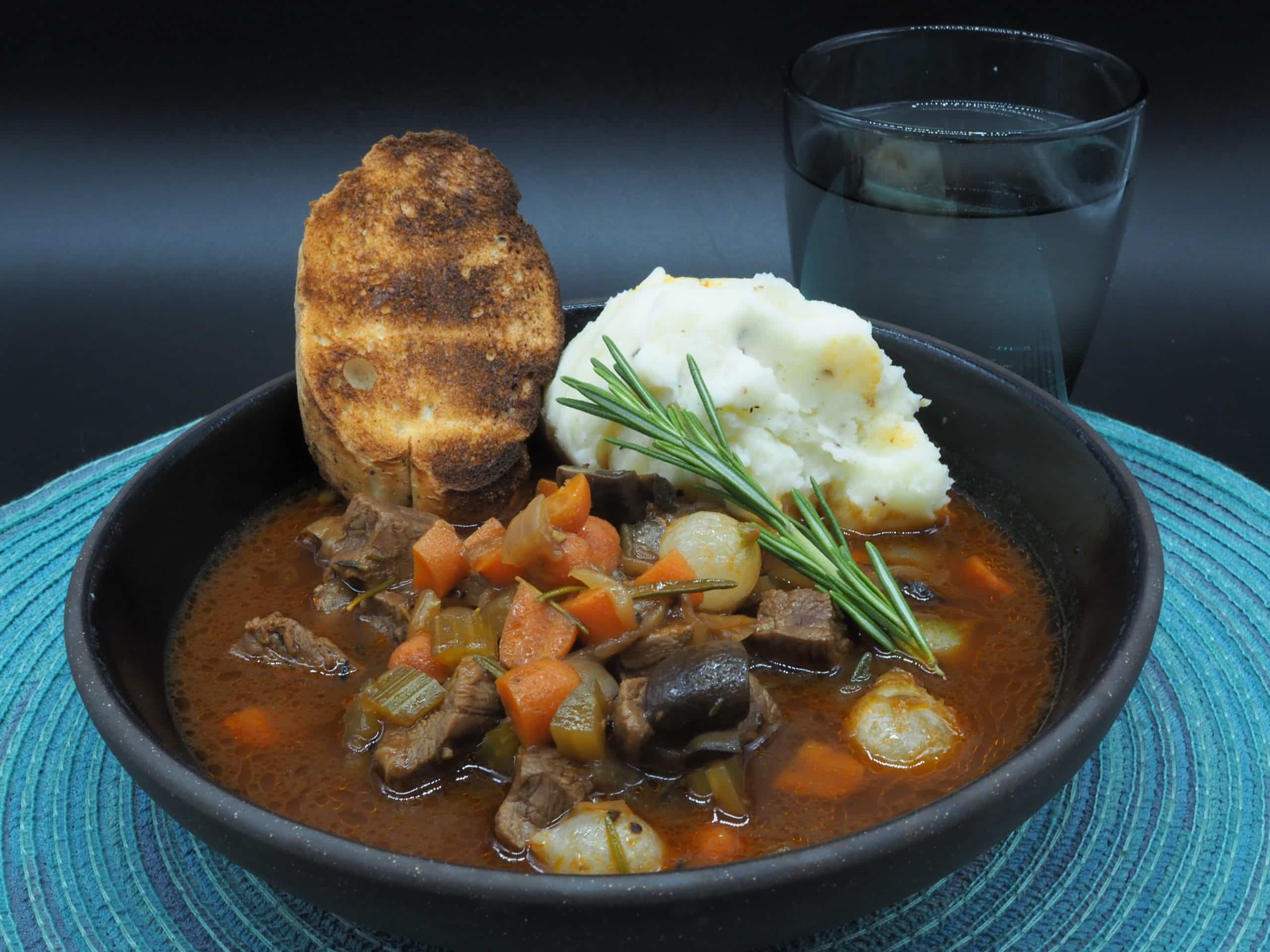 • To serve: Portion the bourguignon into bowls, and serve with mashed potatoes, bread, and sparkling water. Garnish with rosemary.