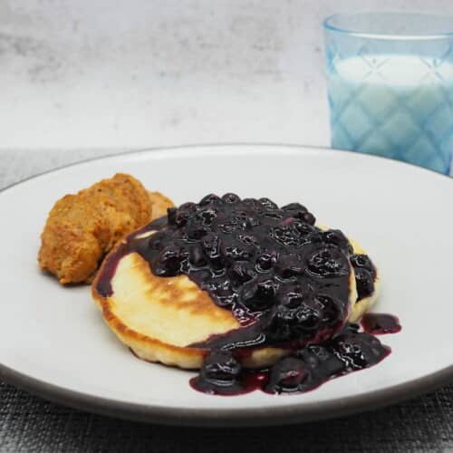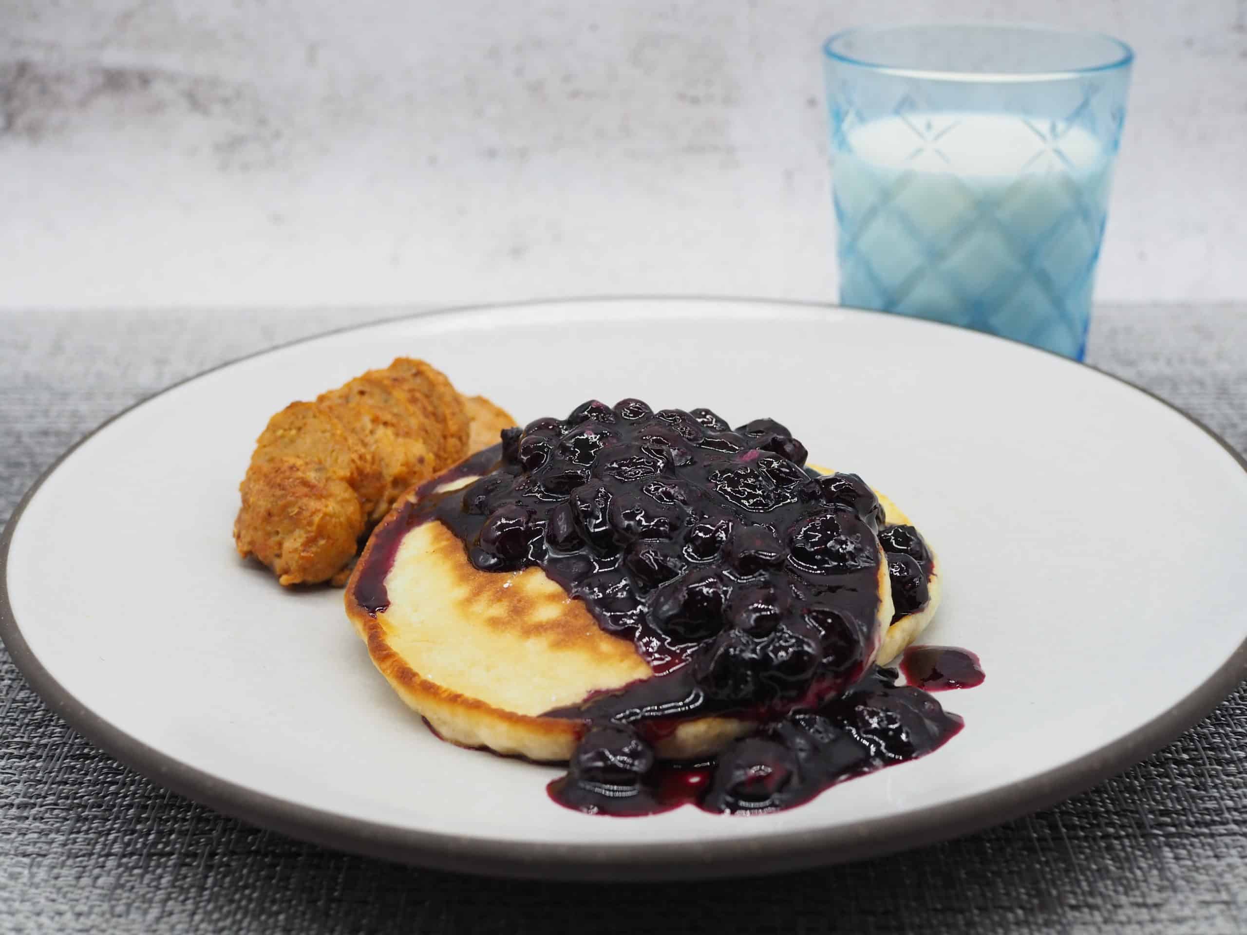 - Top the pancakes with blueberry syrup and serve with chicken sausage.