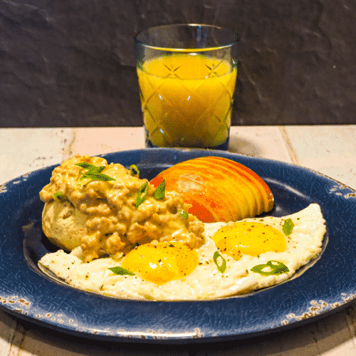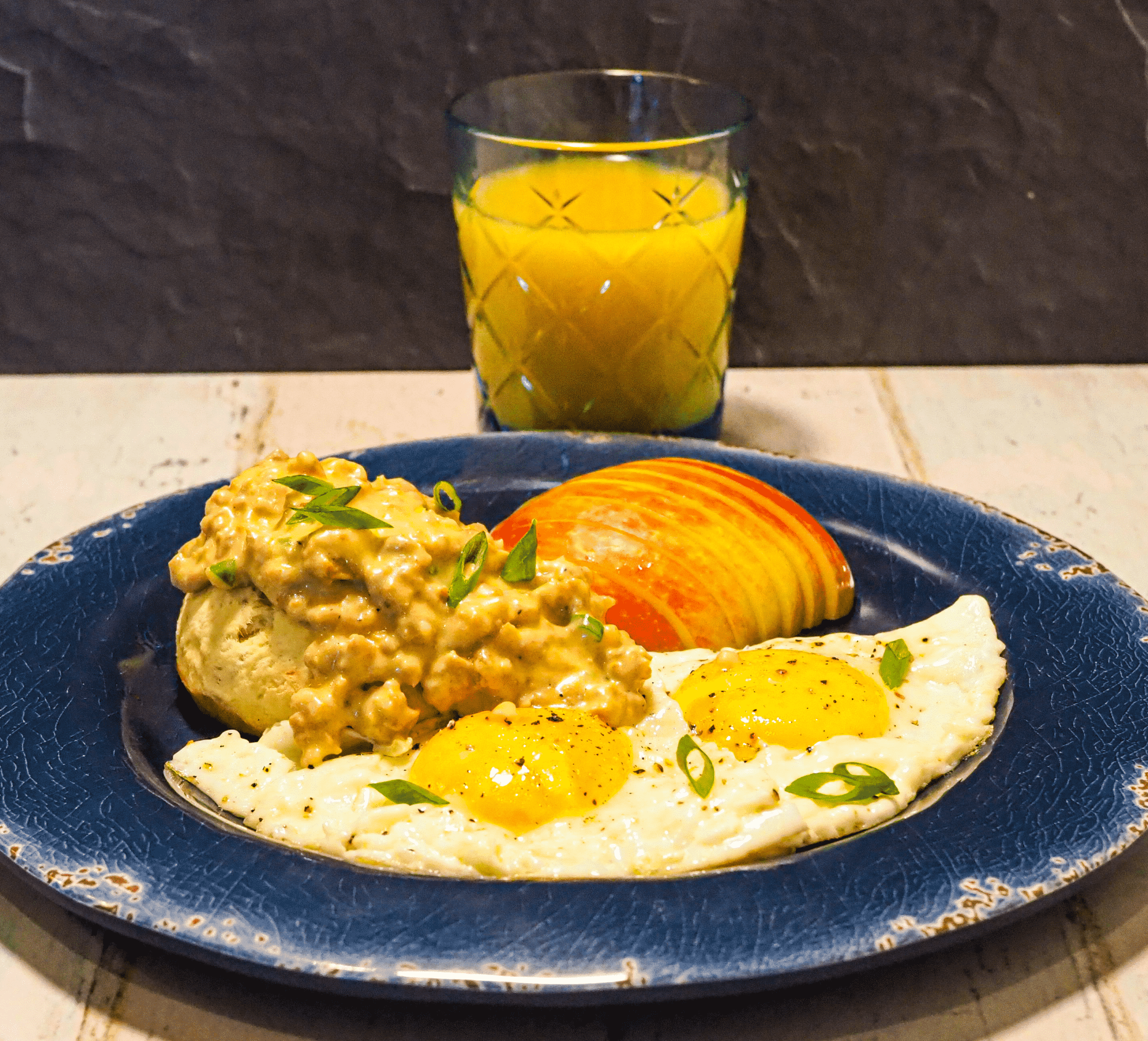 - Spoon the gravy over the biscuits, serve with eggs and pear. Garnish with scallions.