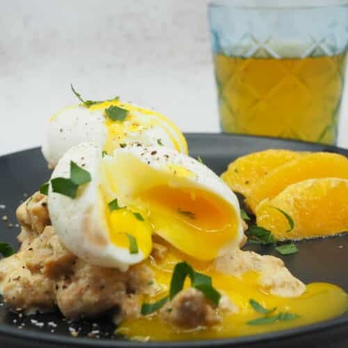 - Peel the eggs, spoon the gravy over the biscuits, top with eggs. Season with salt and pepper. Serve with oranges. Garnish with chives.