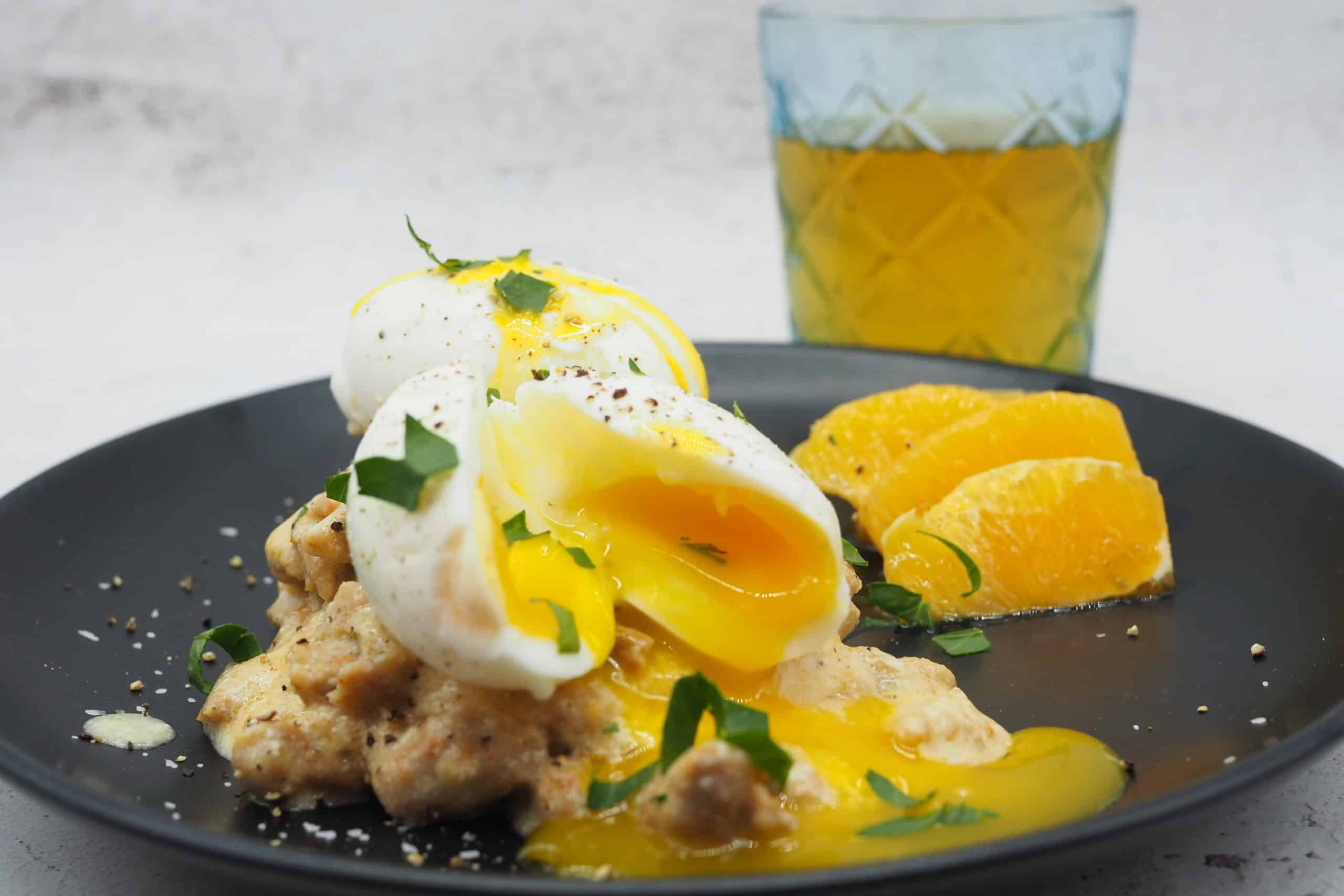 - Peel the eggs, spoon the gravy over the biscuits, top with eggs. Season with salt and pepper. Serve with oranges. Garnish with chives.