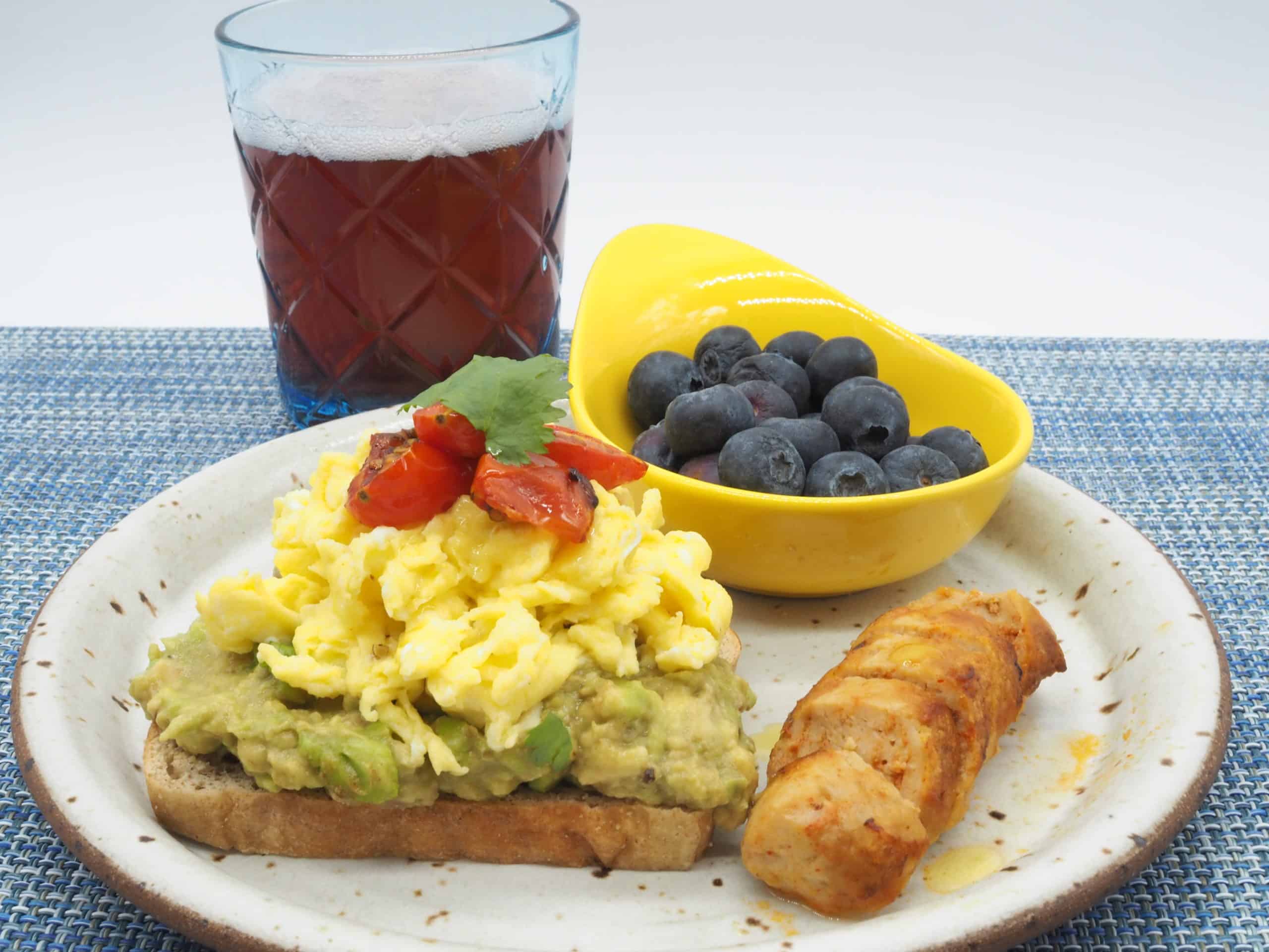 - Top the toast with eggs and tomatoes. Serve with chicken sausage and blueberries.