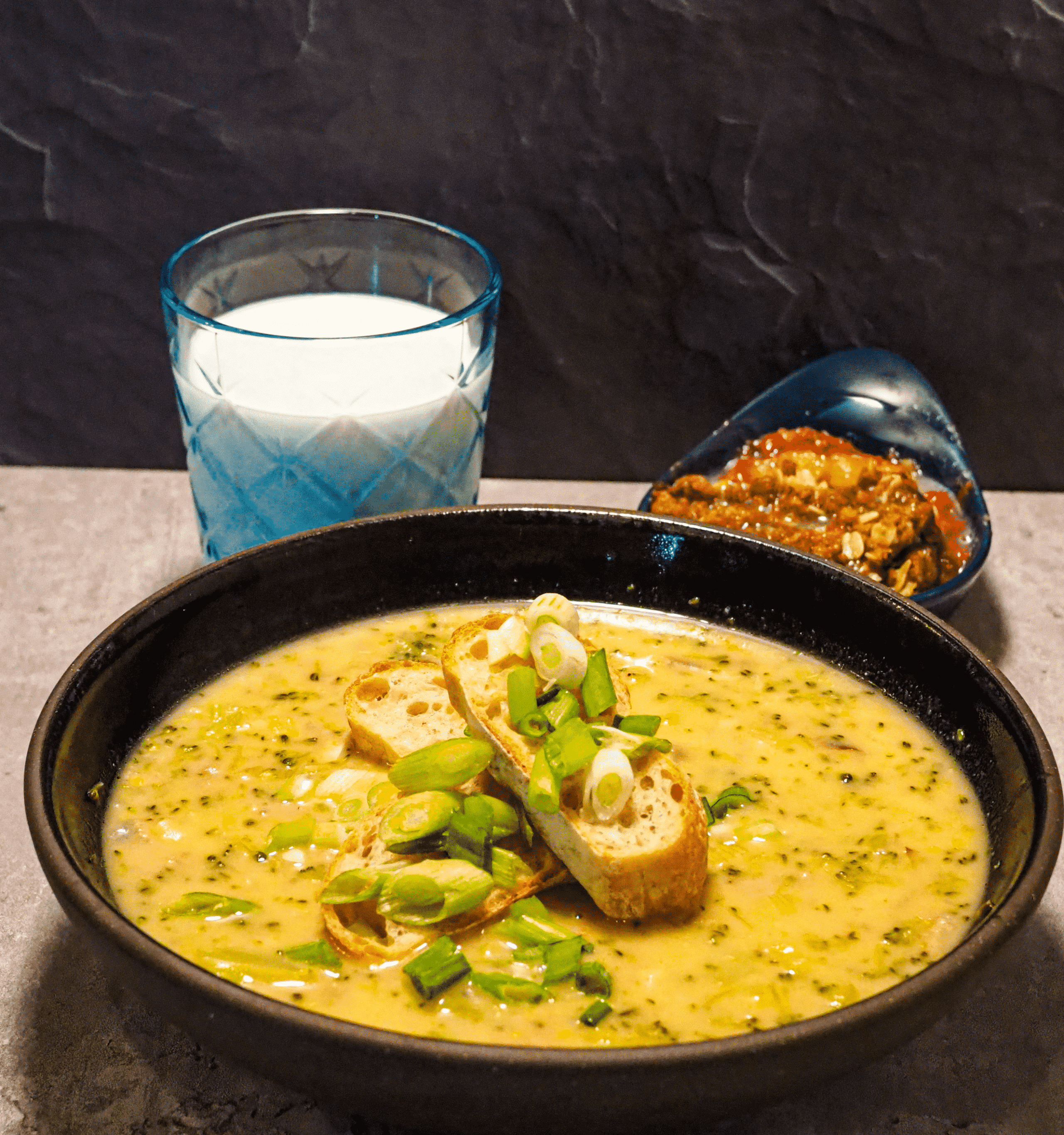 • Stir the broth and broccoli. Season with salt and pepper. Cover with a lid and bring to a simmer for about 15 - 20 minutes until the flavor builds. Stirring occasionally.