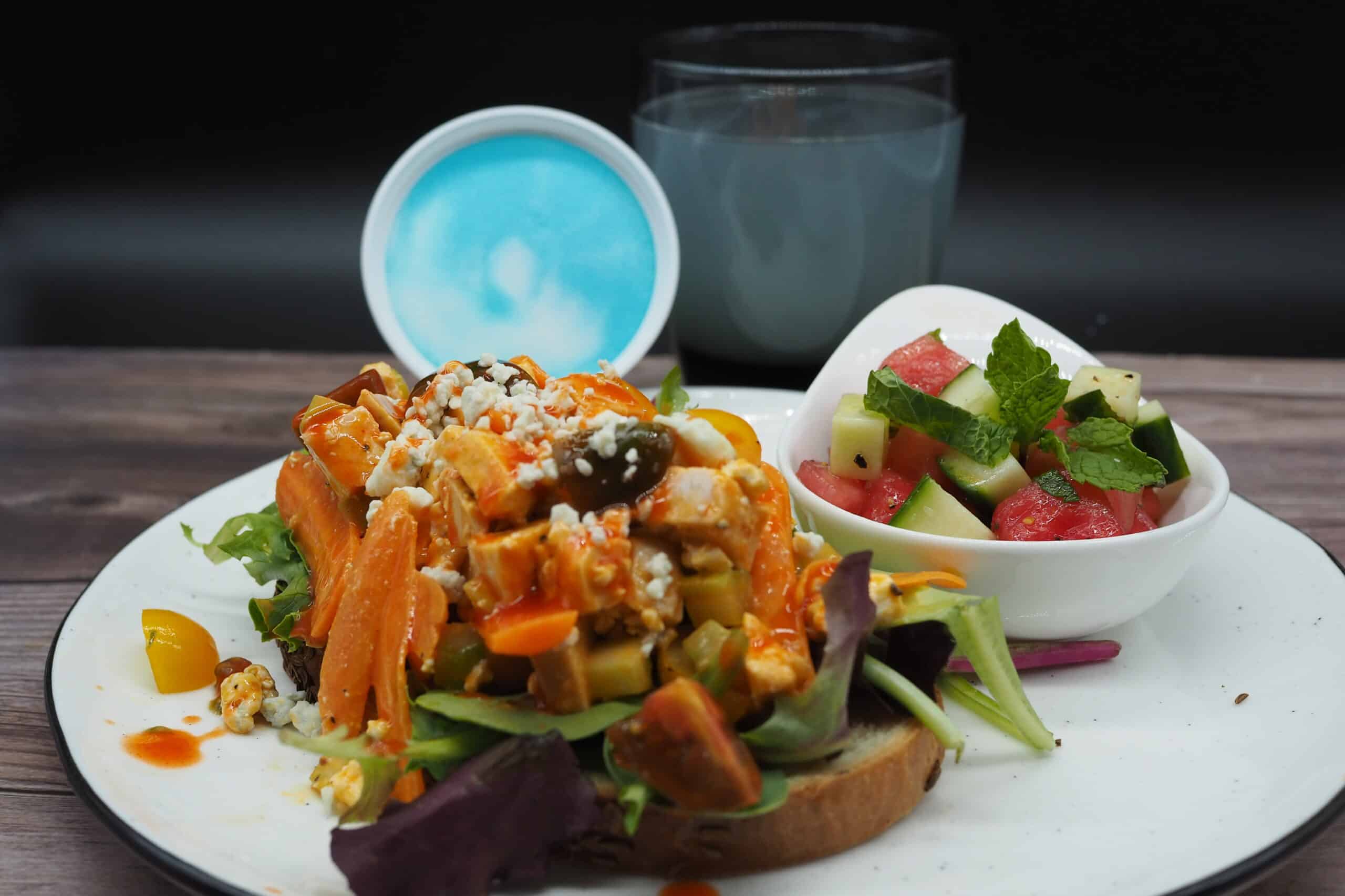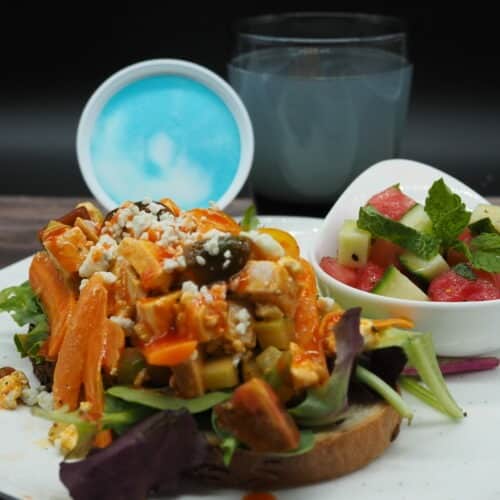 - Layer the bread with spring mix and chicken salad. Garnish with blue cheese.