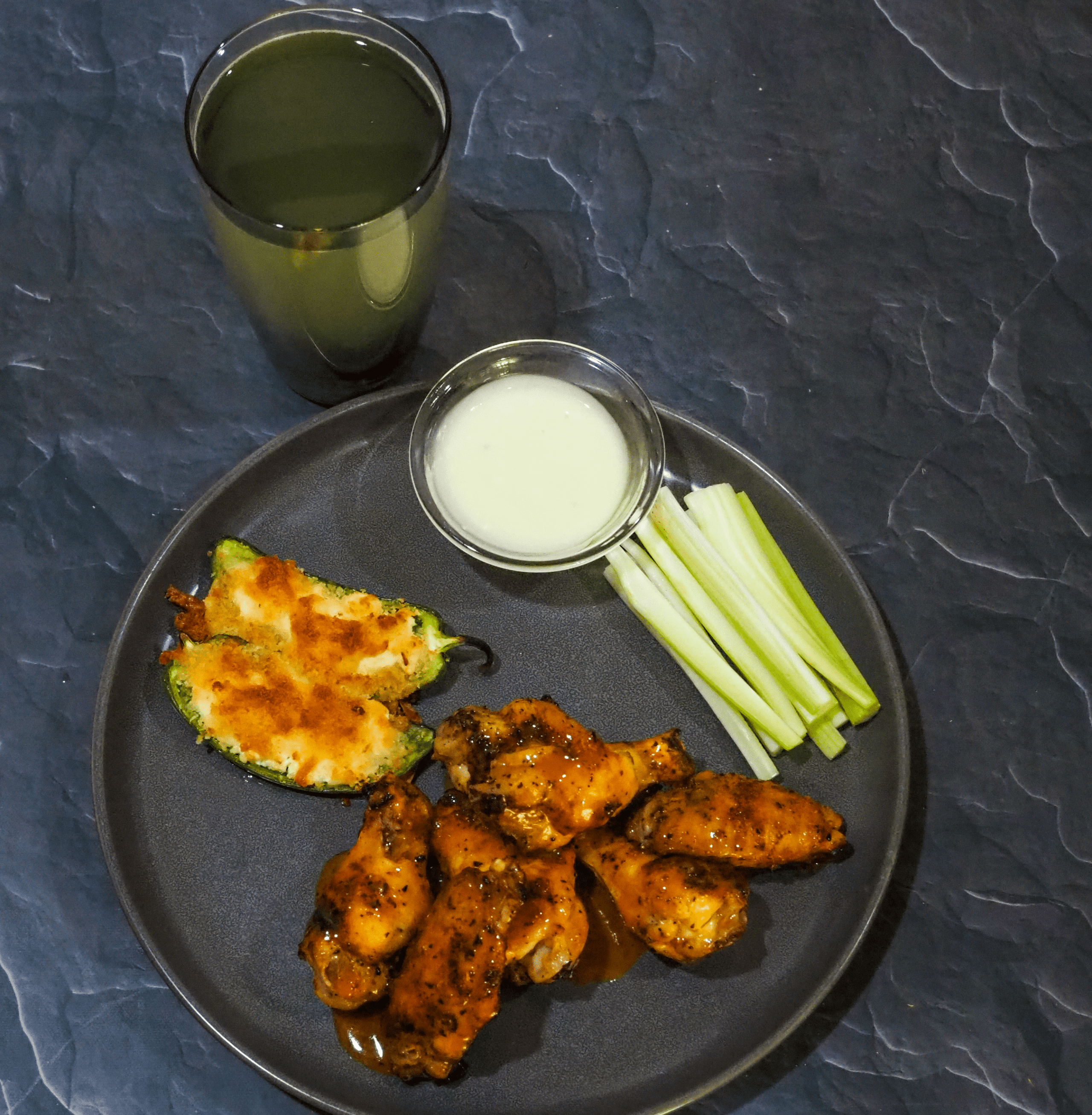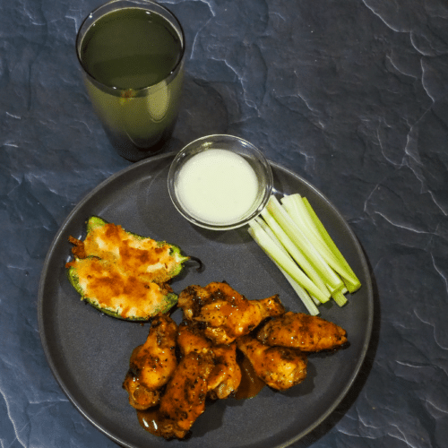 - Serve the wings with jalapeños, celery, ranch, and lemonade.