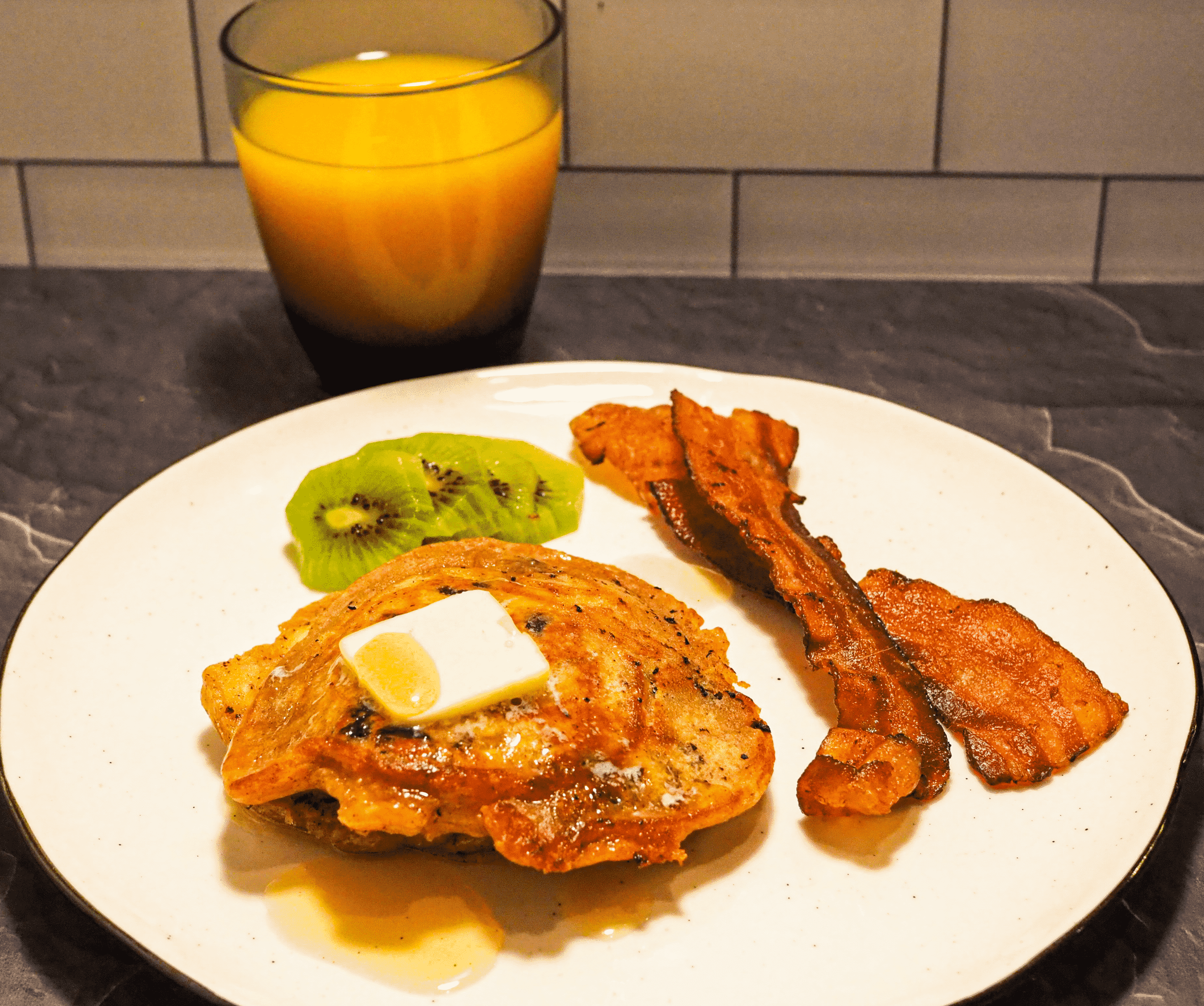 - Top with butter and maple syrup. Serve with bacon and kiwi.