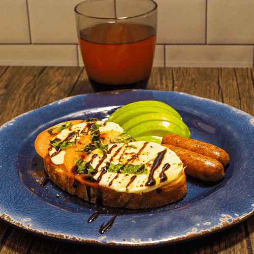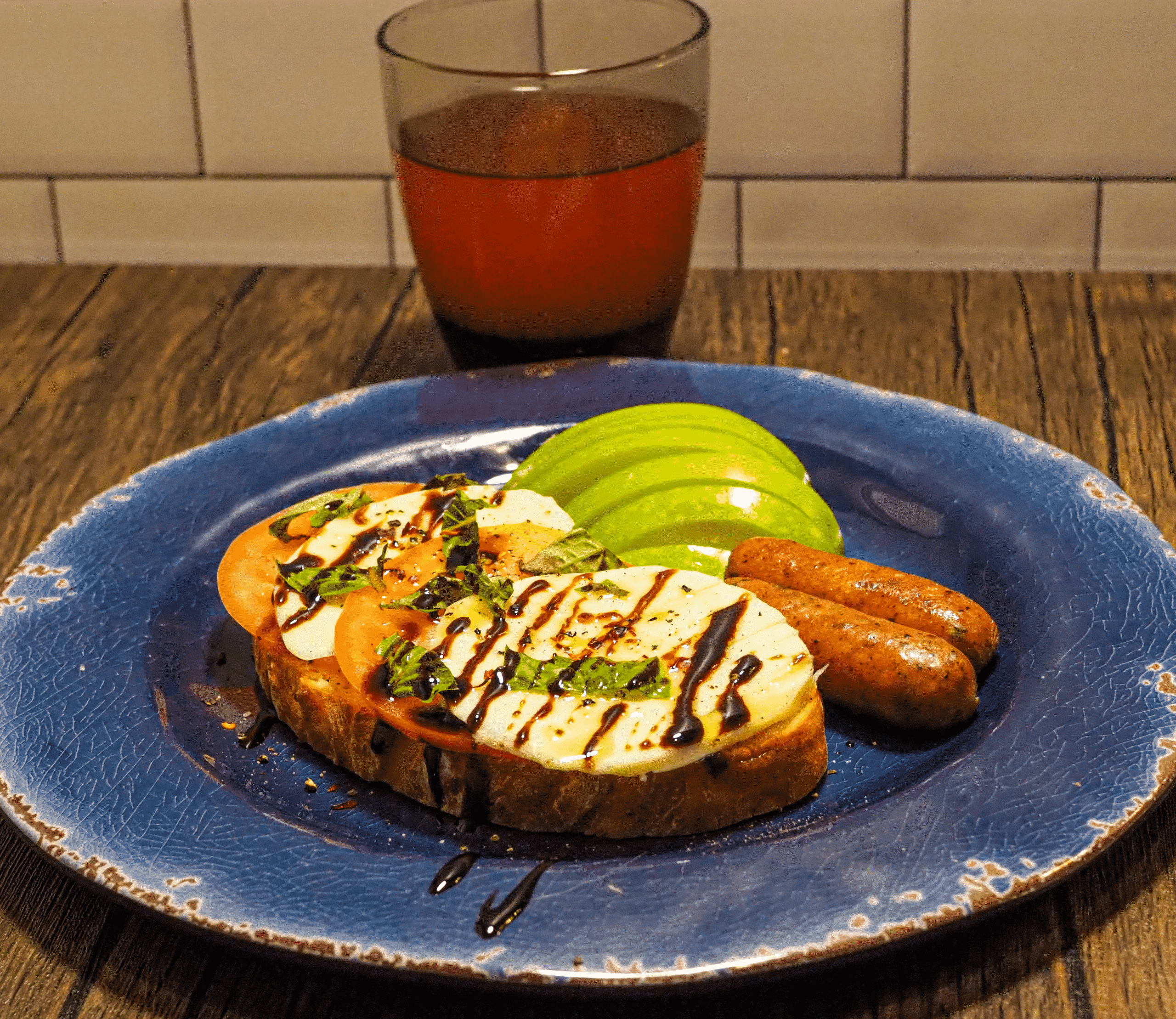 - Alternate the tomato and mozzarella on the bread, drizzle with a little oil, season with salt and pepper. Drizzle with balsamic glaze. Serve with chicken sausage and apple. Garnish with basil and red pepper flakes (if desired).