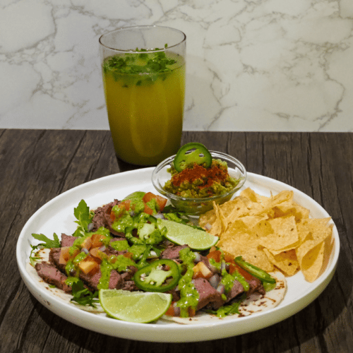 • Serve: Layer the tortilla shells with arugula, steak, tomato, onion, and jalapeno then drizzle with sauce. Enjoy with lime wedges, chips, guacamole, and agua fresca.