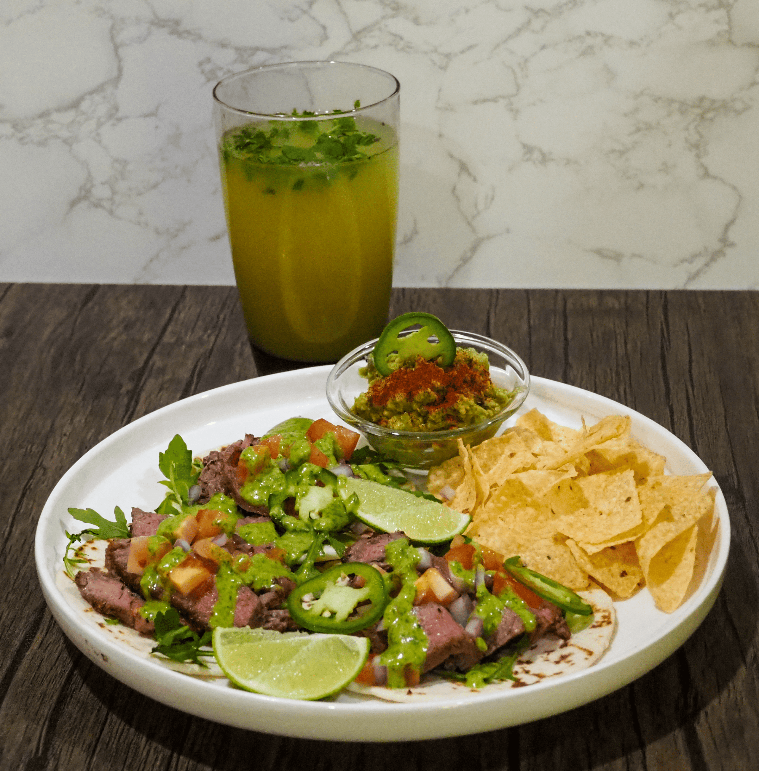 • Serve: Layer the tortilla shells with arugula, steak, tomato, onion, and jalapeno then drizzle with sauce. Enjoy with lime wedges, chips, guacamole, and agua fresca.