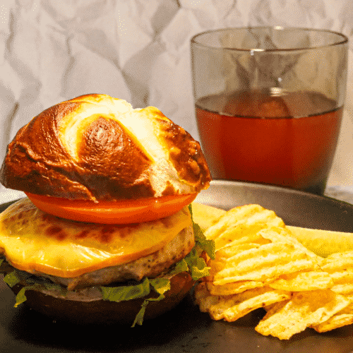 - Lightly toast the rolls. Spread the sauce onto both halves of the roll. Place the burger on the bun with lettuce and tomato. Serve with pickles and chips.