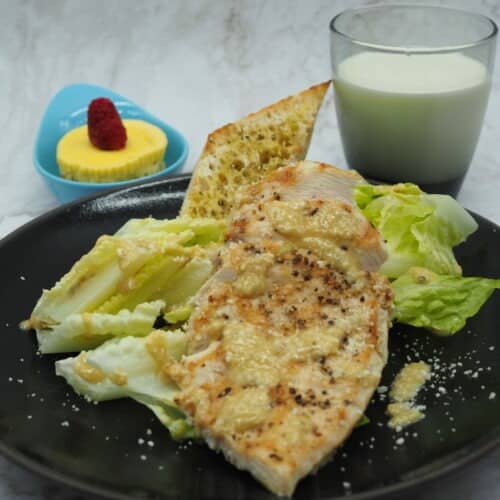 - Serve the chicken over the lettuce and drizzle with about 2 teaspoons of the dressing on top or more if desired (do not over dress the salad). Serve with bread. Garnish with parmesan.