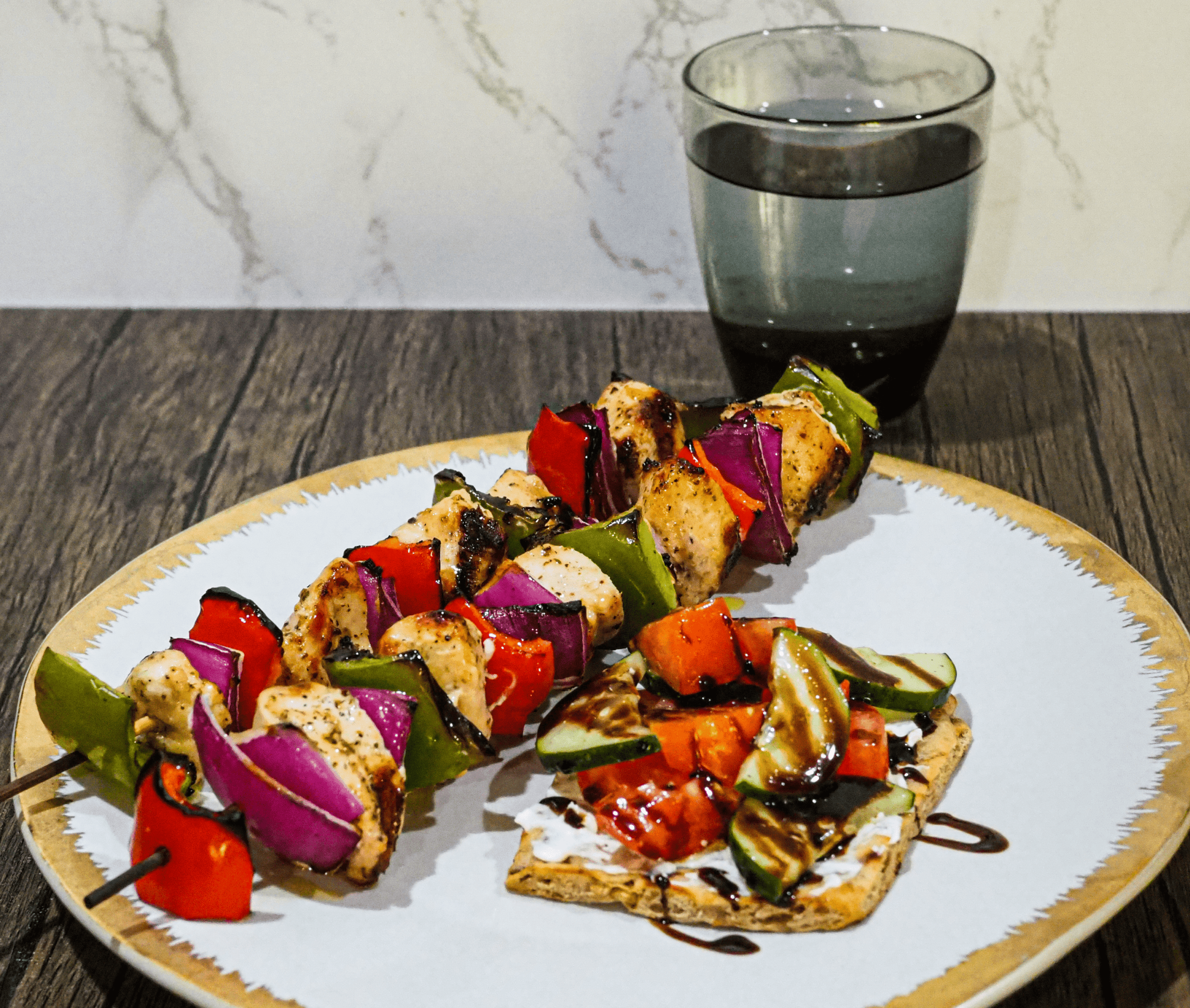 - Serve: Plate the kabobs, enjoy with the heirloom tomato toast and sparkling water.