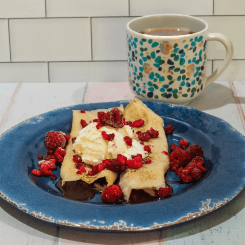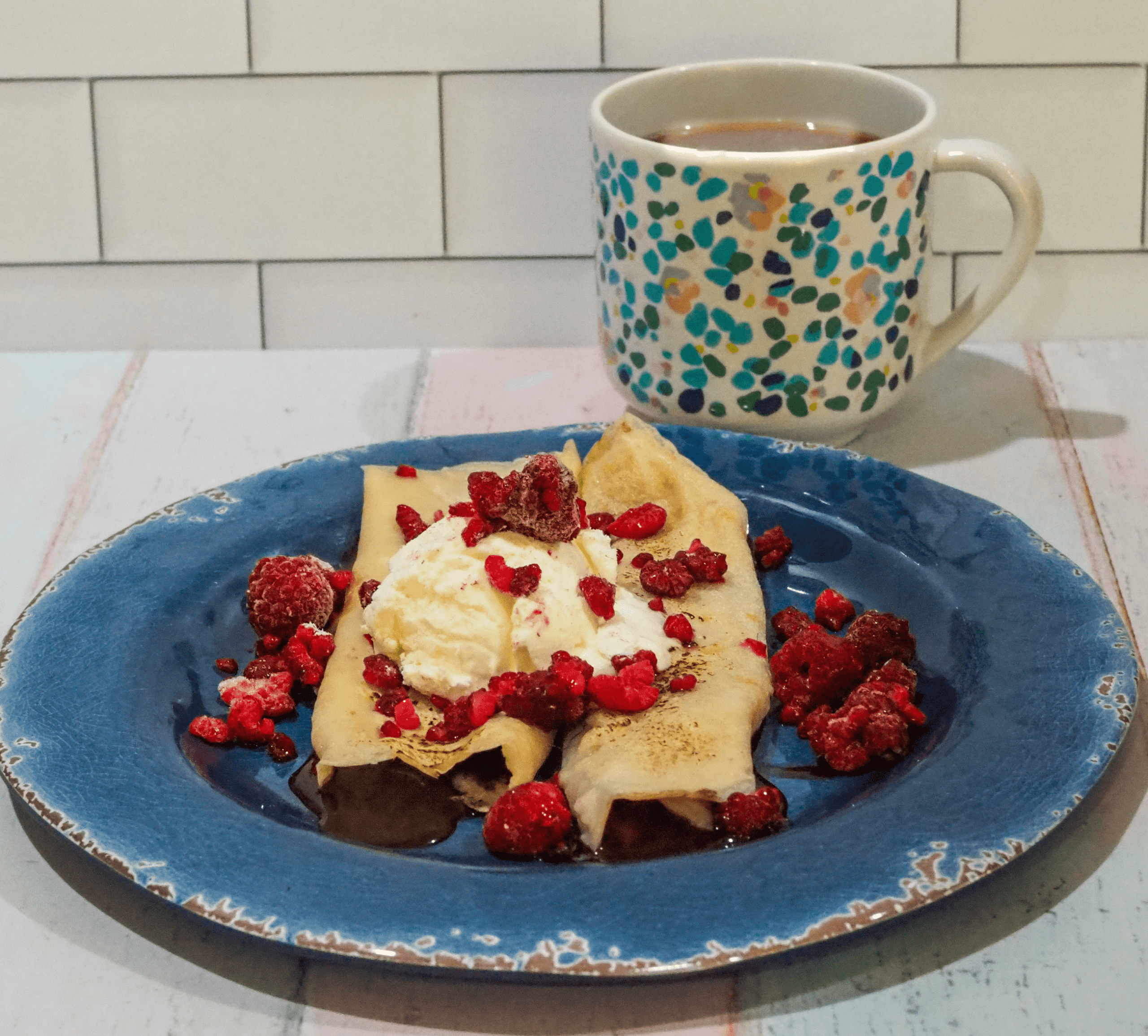 • Top the crêpes with whipped cream and raspberries and enjoy with coffee (with milk and sugar if desired).