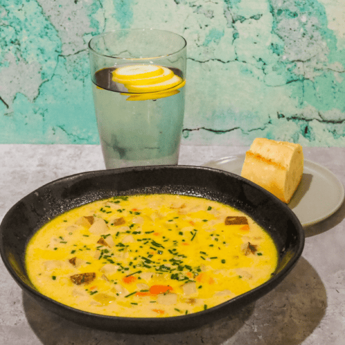 - Portion the soup and garnish with chives. Serve with bread and spritzer.