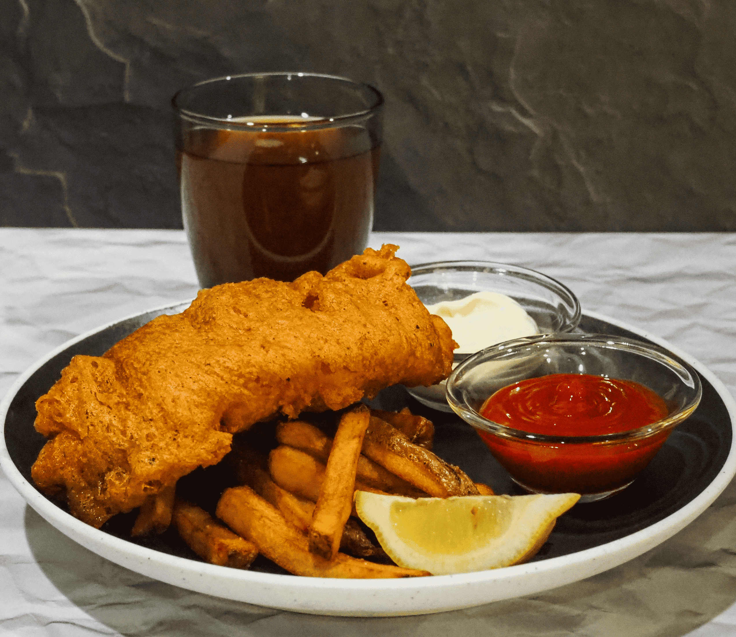 • Serve the fish with tartar sauce, lemon wedge, french fries, ketchup, and iced tea.