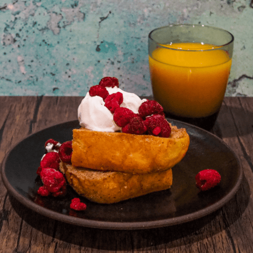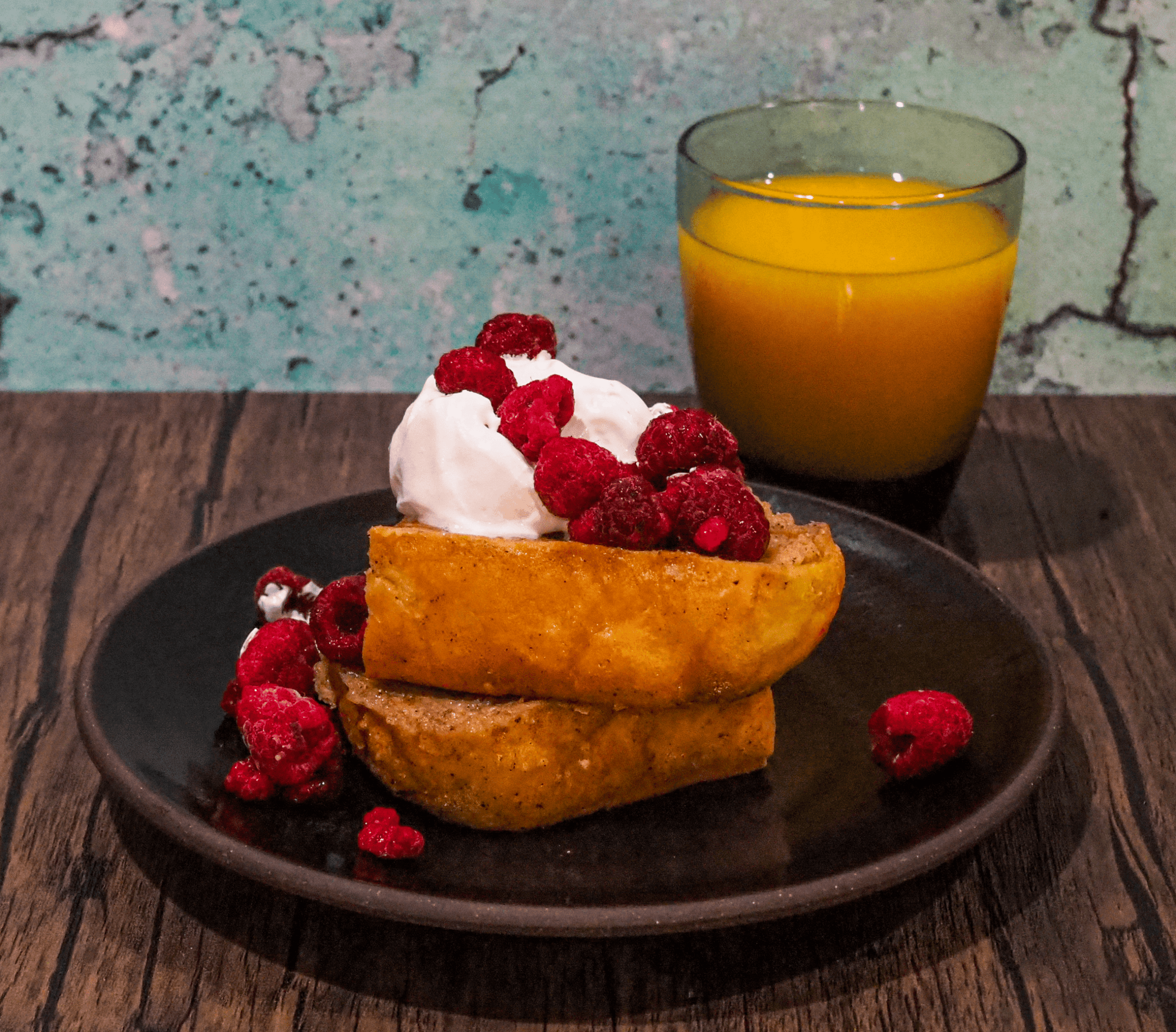 - Drizzle the french toast with syrup and top with whipped cream. Serve with raspberries and orange juice.