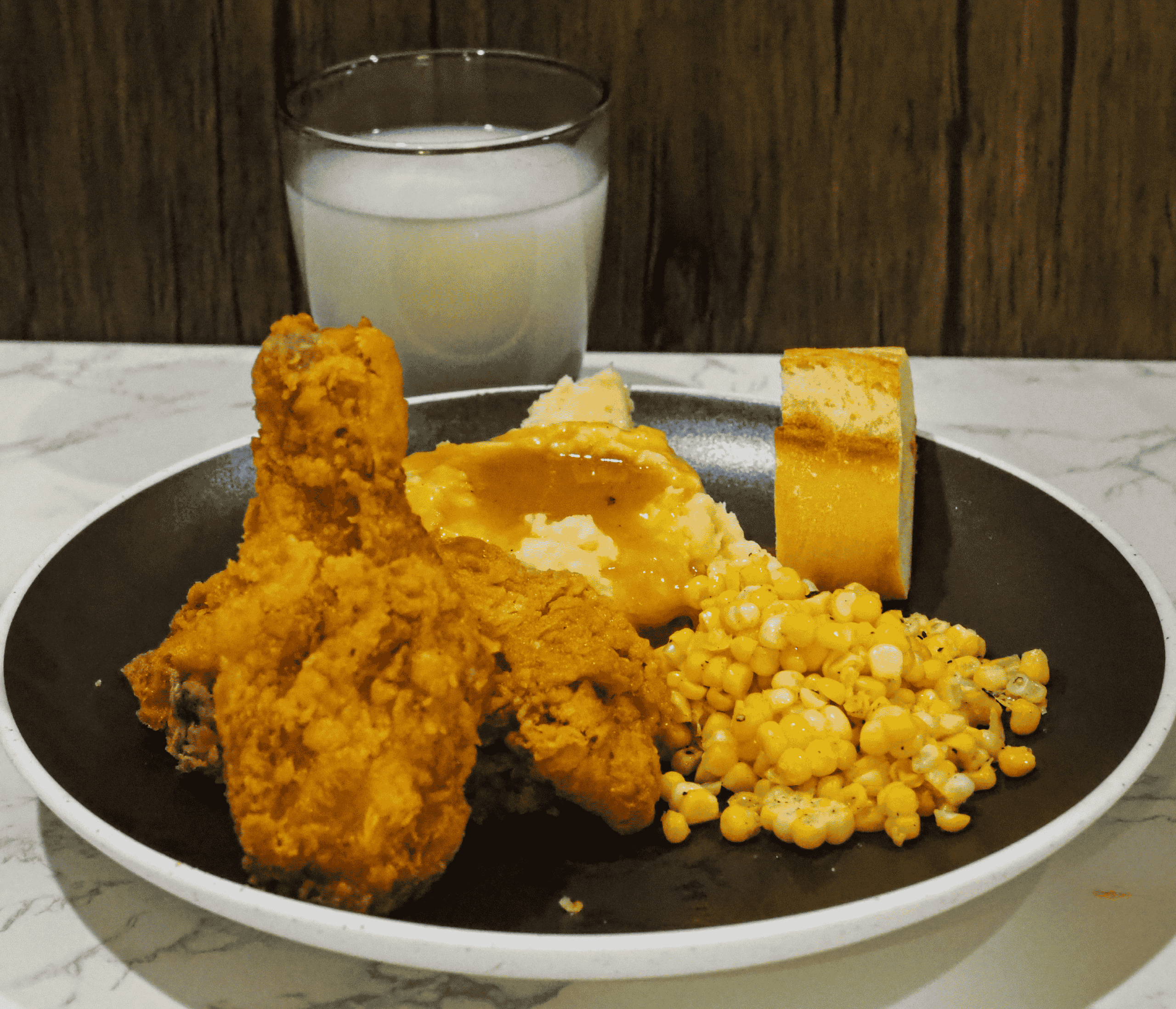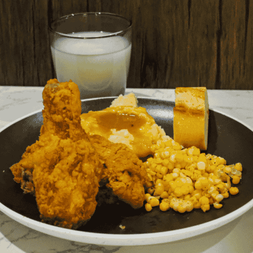 - Serve: Enjoy fried chicken with mashed potatoes, gravy, corn, and milk.