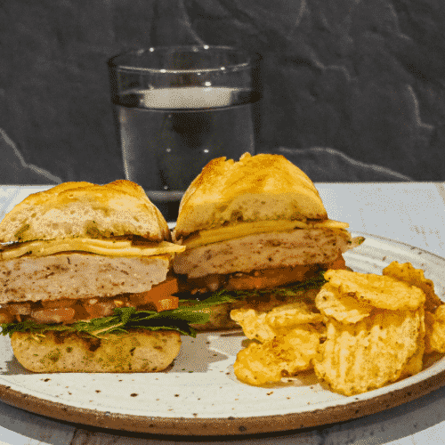 - Cut the sandwich in half and serve with chips and pickles.