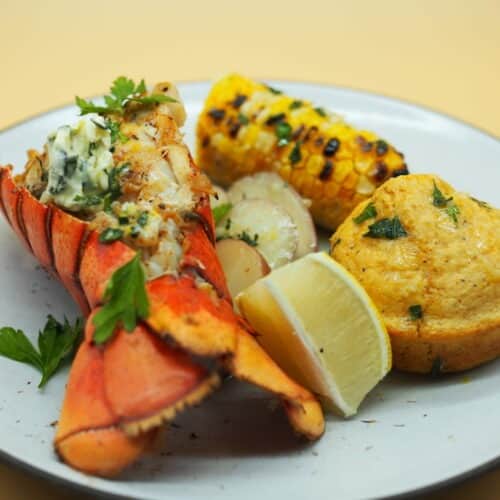 - Remove lobster tails from the grill and serve with more herb butter and lemon wedges.