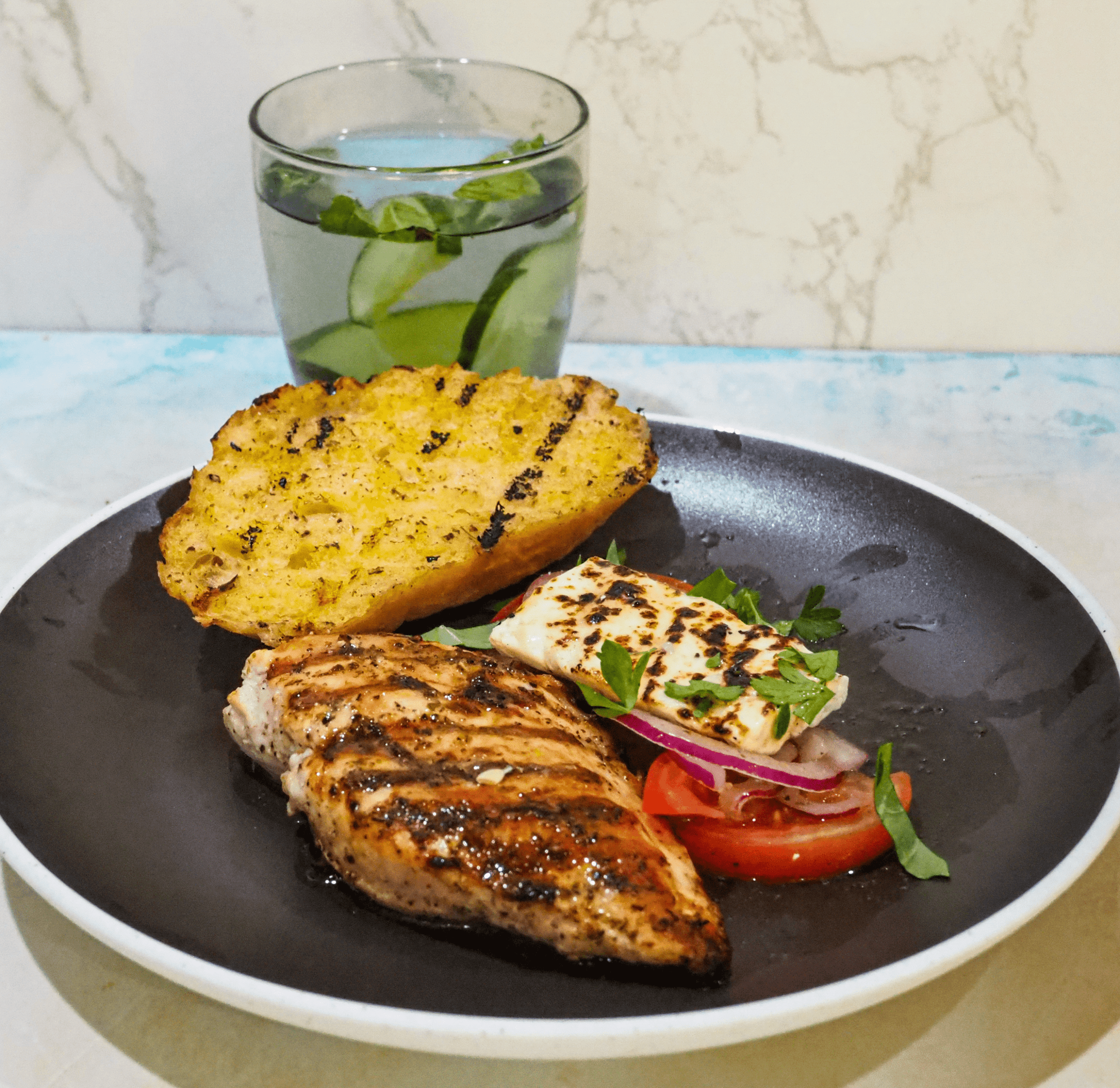 • Serve: Enjoy salad immediately with the grilled chicken, bread, and cucumber mint water.