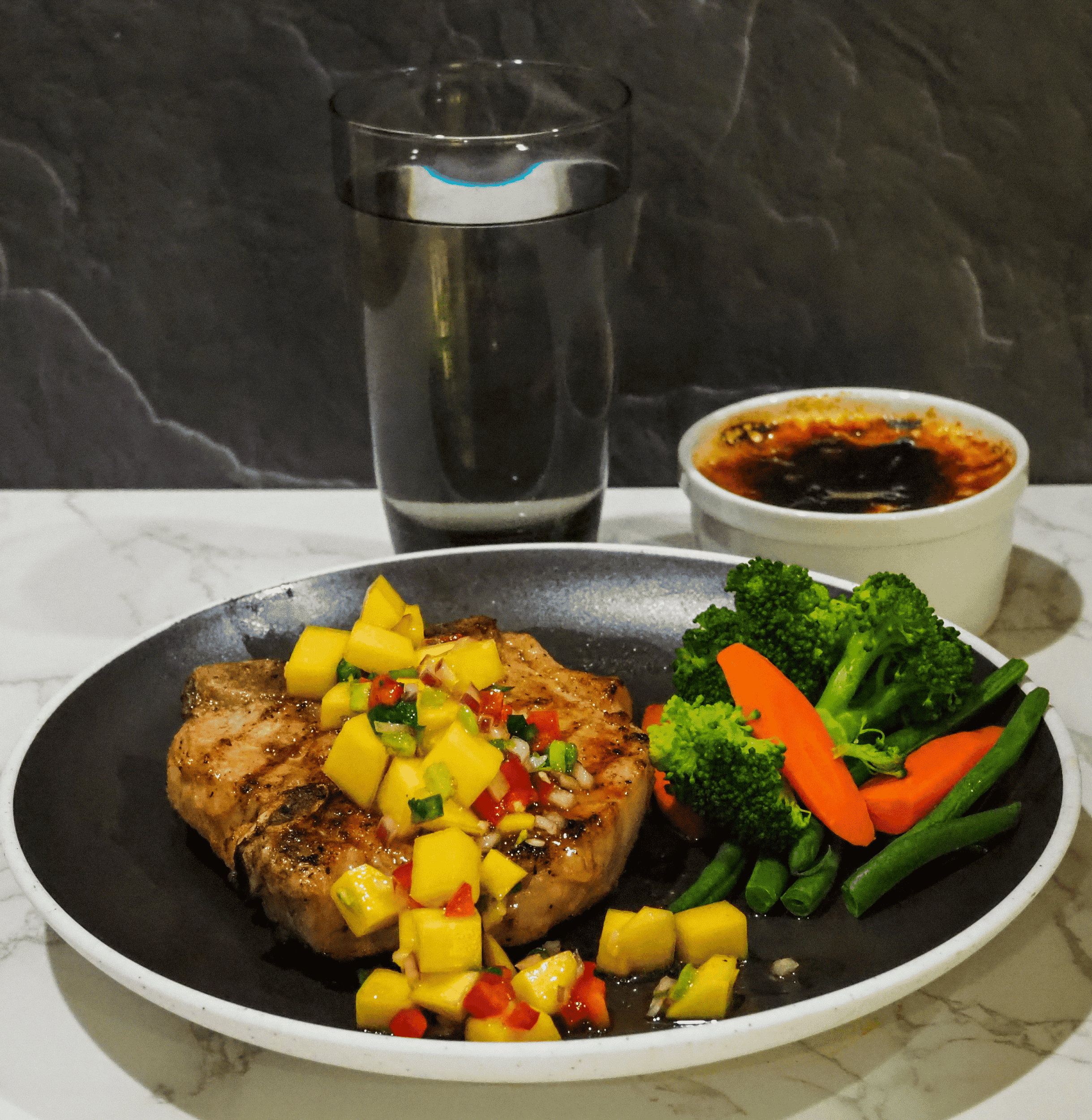 - Serve the pork chops topped with mango salsa, steamed vegetables, bread (if using), and crème brûlée. Enjoy with sparkling water.