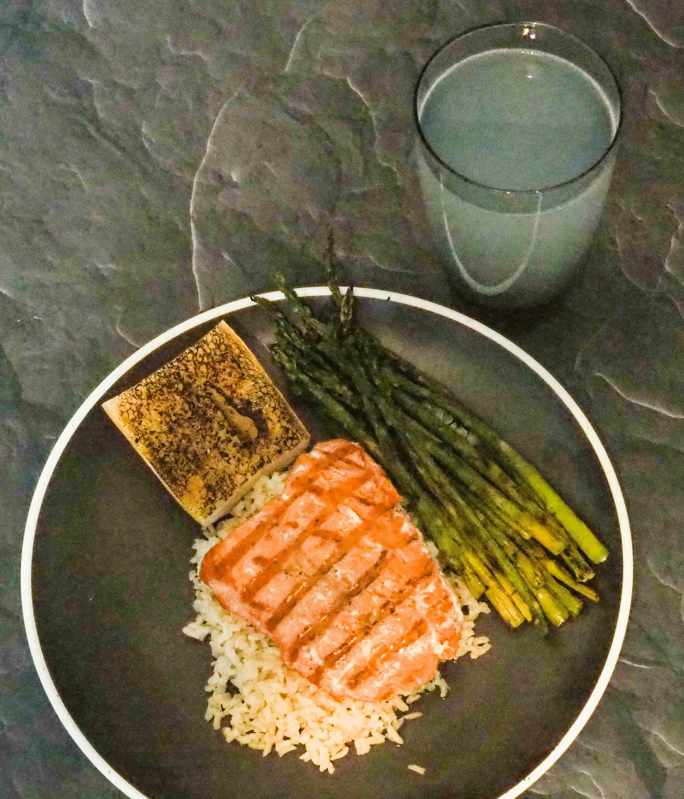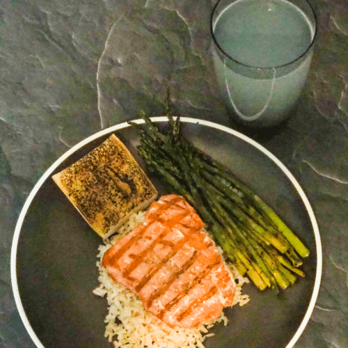 - Serve the salmon with rice, asparagus, bread, and lemonade.