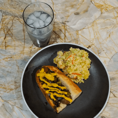 - Place the cooked sausage link on the roll, and top with peppers and onions. Top with ketchup or mustard as preferred. Serve with potato salad, and lemonade.
