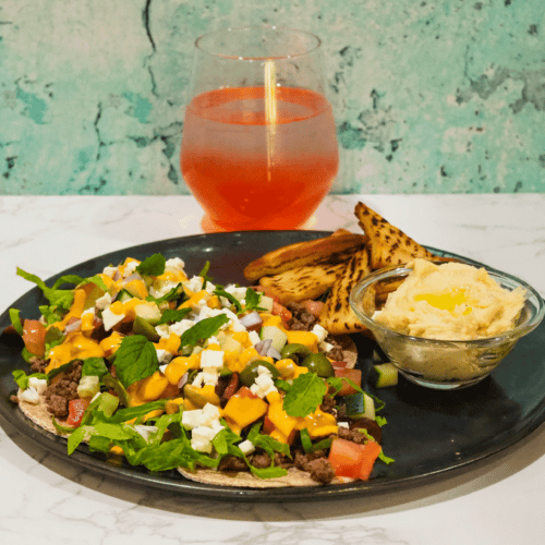 - Layer the taco shells with beef mixture, lettuce, tomato, onion, sauce, and feta. Serve with hummus, pita chips, and ginger spritzer.