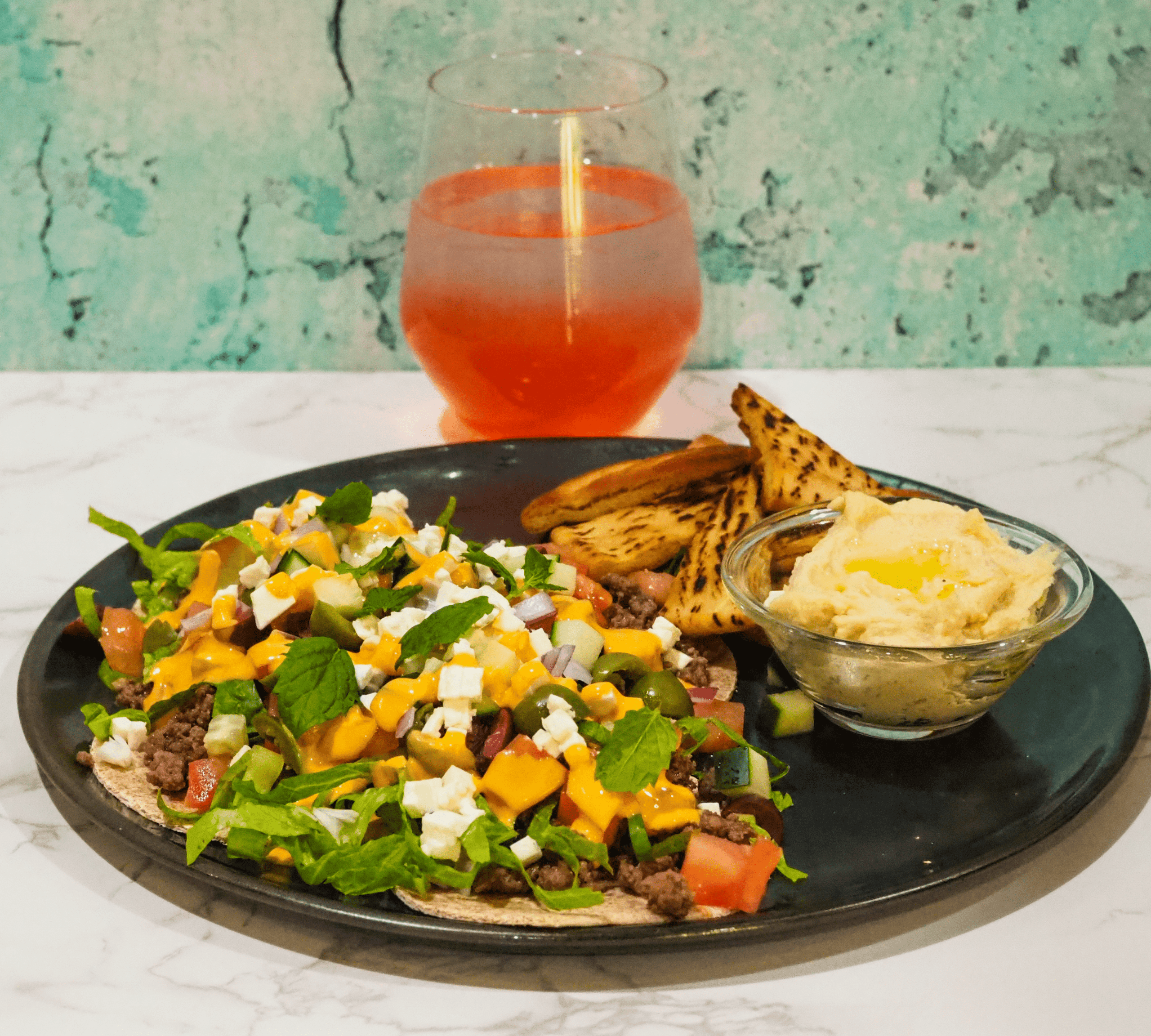 - Layer the taco shells with beef mixture, lettuce, tomato, onion, sauce, and feta. Serve with hummus, pita chips, and ginger spritzer.