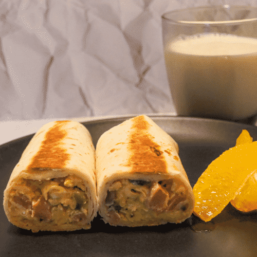 • In a pan over medium heat, place the wrap seam side down until golden brown, then flip over and do the same on the other side.
