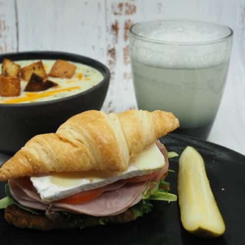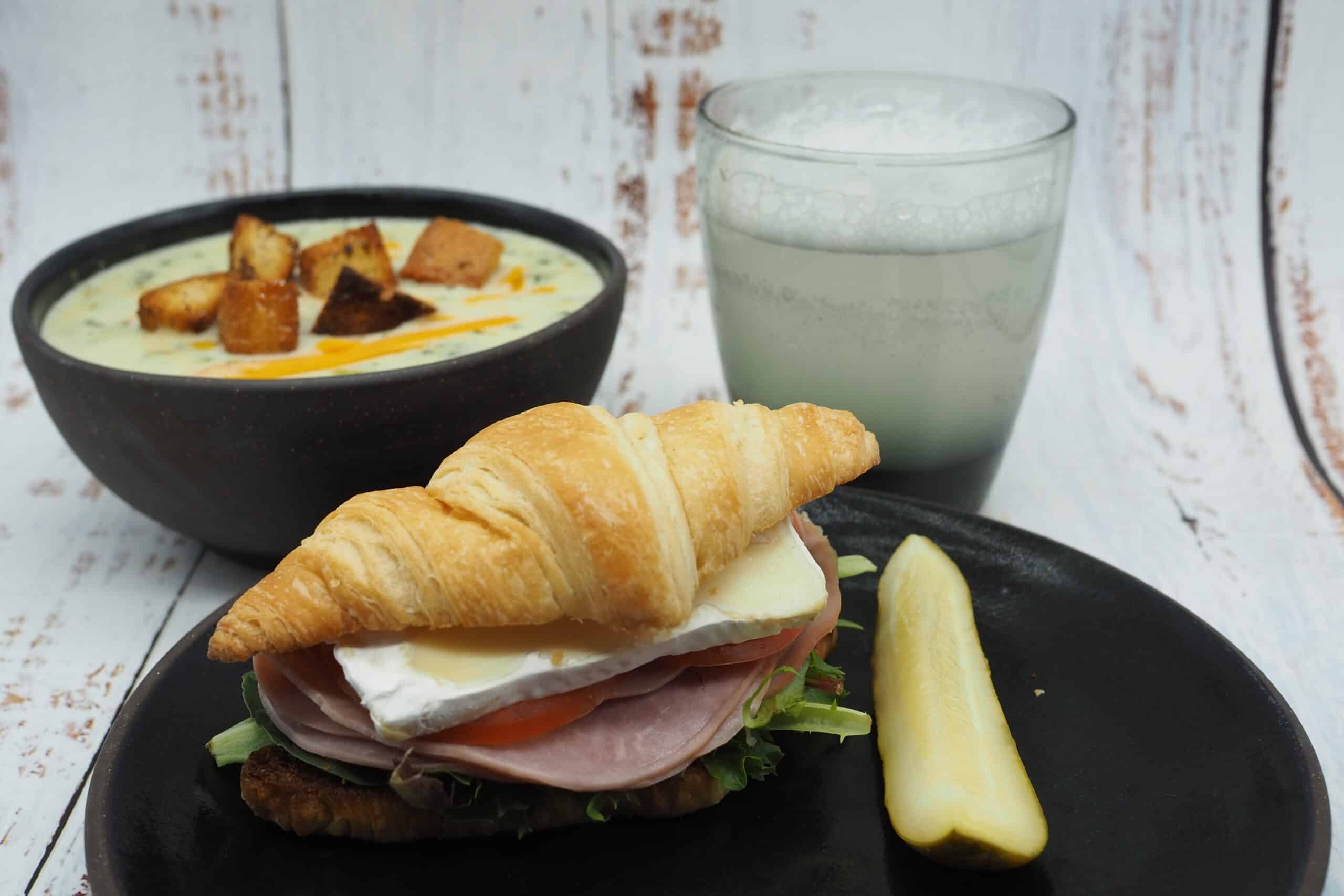 • Spread the mustard and mayo on each half of the croissant and layer with spring mix, ham, tomatoes seasoned with salt and pepper, and brie.