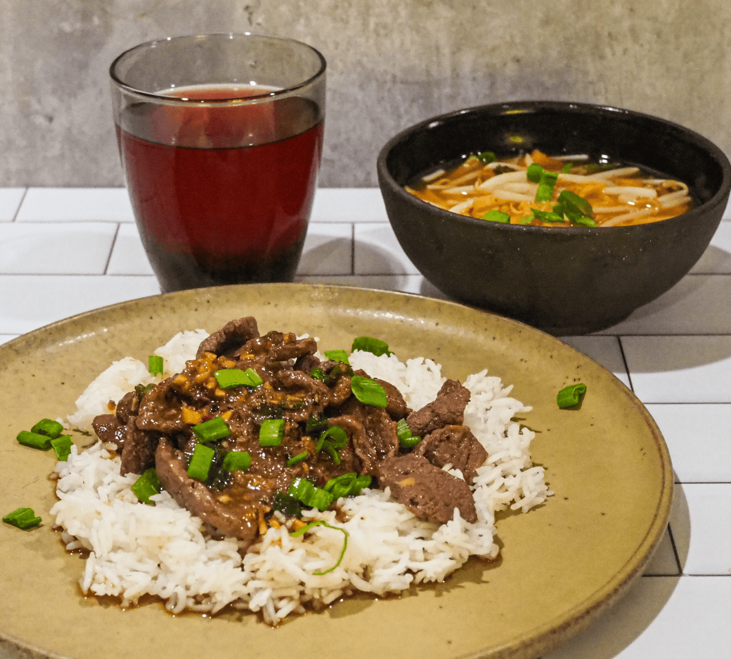 - Serve: Plate the rice and top with beef. Enjoy with soup and kombucha.
