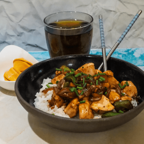 - Make the Kung Pao Chicken: In a non-stick pan over medium heat, heat the sesame oil and the olive oil. Sauté the chicken until nicely browned. Add in the peppers and onions, and sauté for 4-5 minutes until they start to soften. Then add the garlic and ginger, and cook for another 1-2 minutes. Add the chicken broth, soy sauce, molasses, and lime juice, and bring to a simmer. Add the dissolved cornstarch and simmer until the sauce thickens to a smooth consistency. Adjust the seasonings by adding soy sauce or salt to taste. Keep warm over low heat until you are ready to serve.