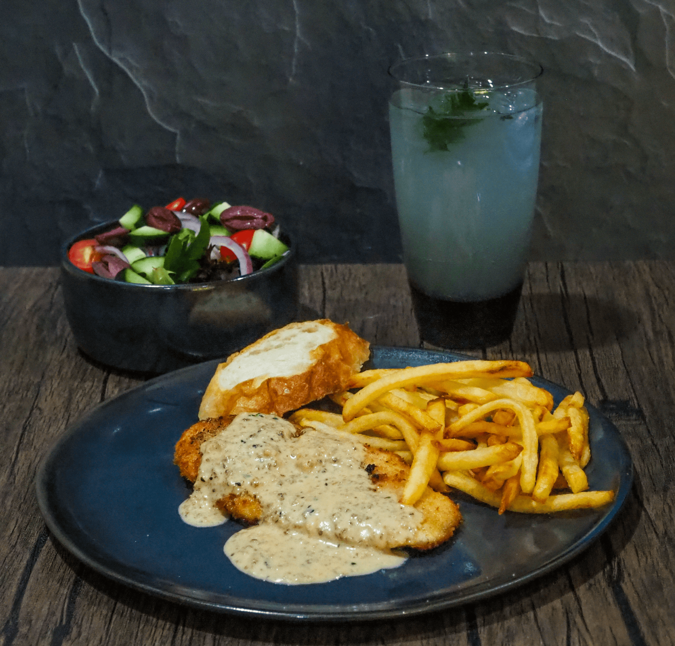 - Spoon the sauce over the chicken. Garnish with parsley. Serve with french fries, ketchup, bread, and spritzer.