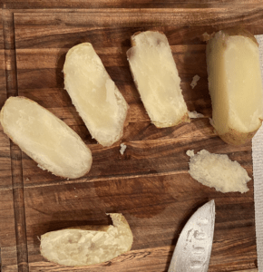 - Slice 4 sides off the potato to create potato skins (discard the center or save and use for breakfast home fries if desired). Season with salt and pepper. Drizzle with oil. Then place under the broiler to golden brown and crispy.