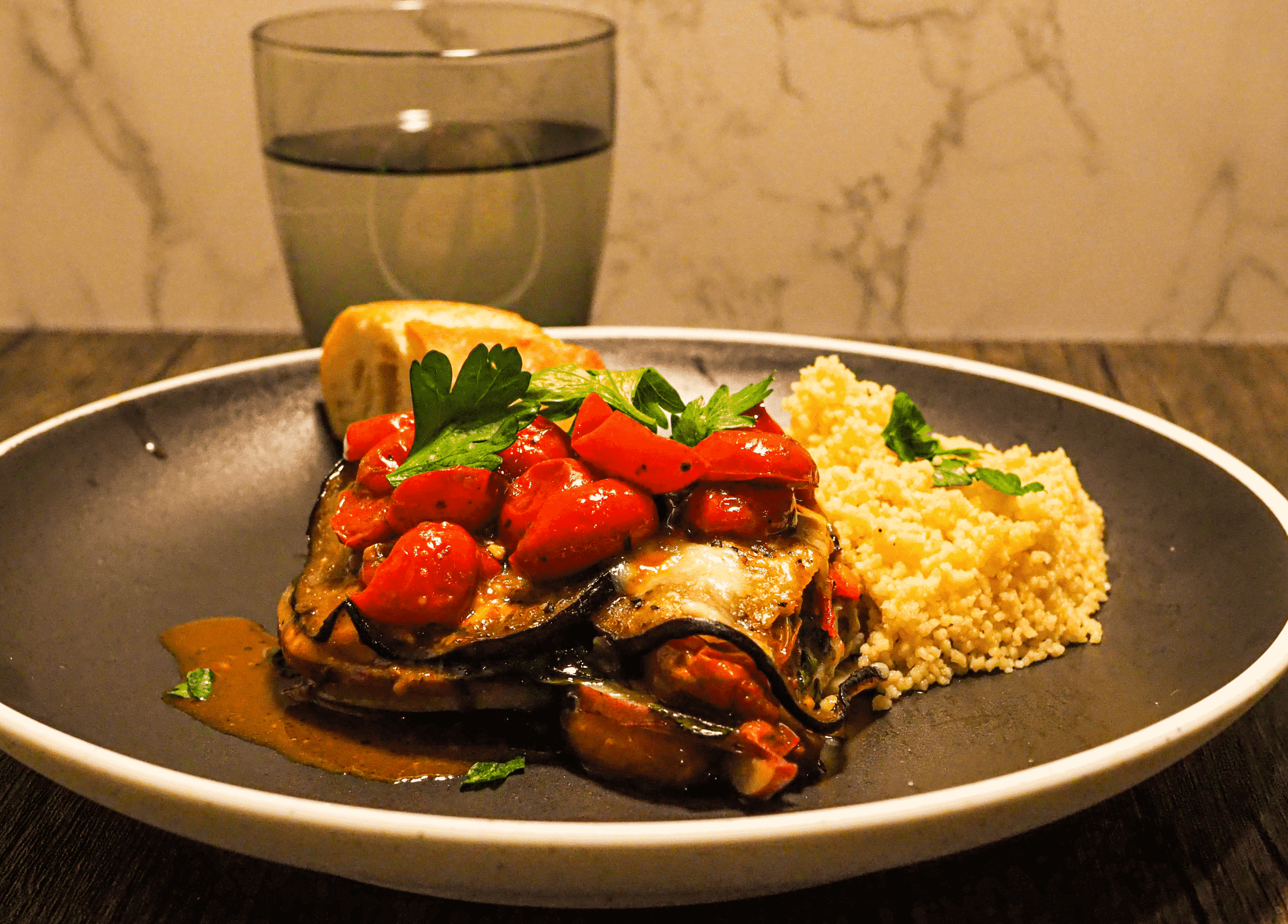 - Lightly grease an 8x8 baking dish (or larger if making more portions to use for next weeks grilled cheese recipe) with oil. Shingle half of eggplant on the bottom of the baking dish. Drizzle with oil and season with salt and pepper. Spread half of the spinach on top. Add half of the yellow squash, and 1/3 of the tomato mixture. Then shingle the potatoes, drizzle with oil, and season with oregano, salt and pepper. Spread half of the asiago over the potatoes. Spread the remaining spinach, yellow squash, and another 1/3 of the tomato mixture. Shingle the remaining eggplant over top. Drizzle with oil and season with salt and pepper. Cover tight with foil.