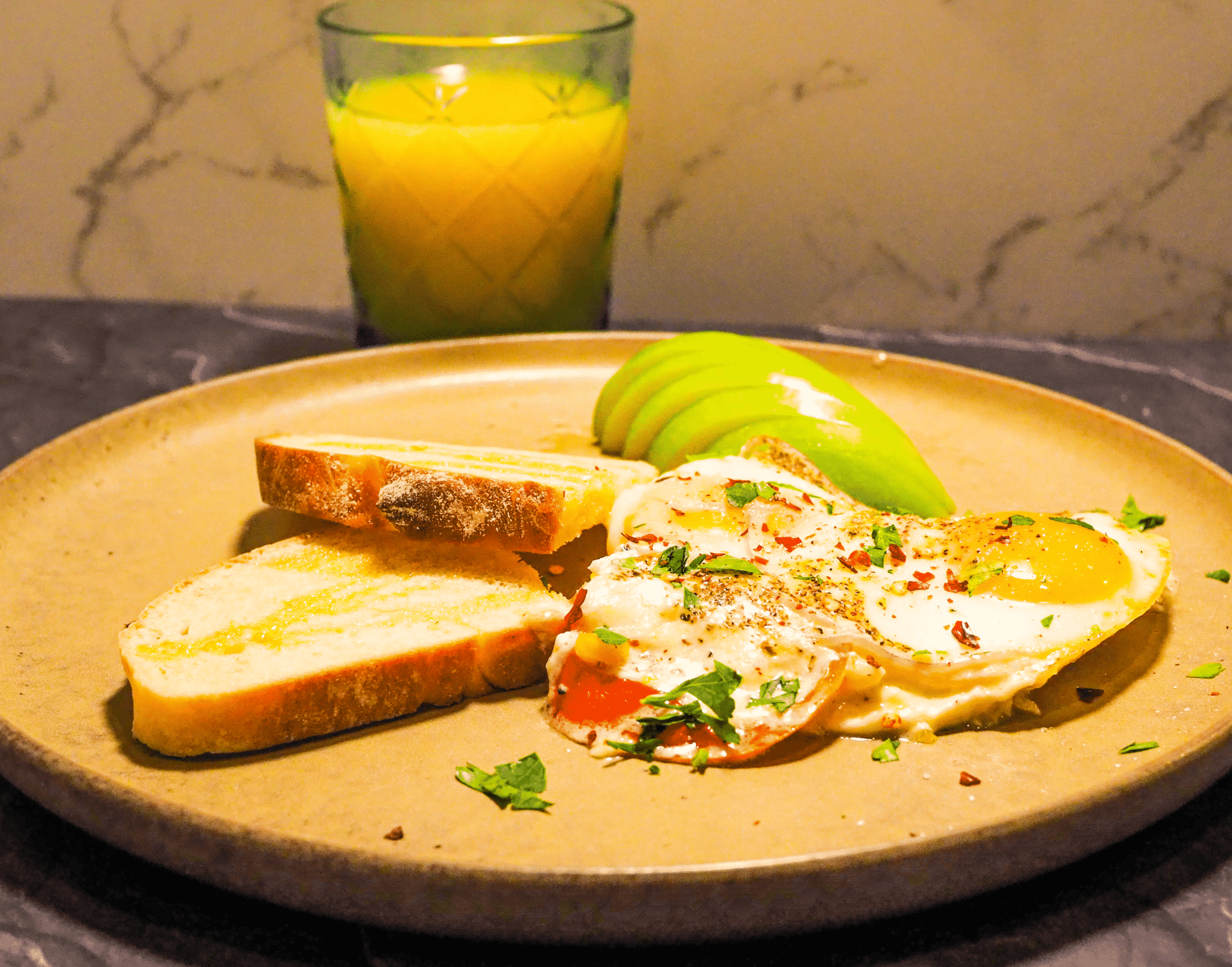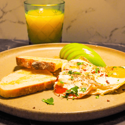 - Portion, drizzle the toast with a little olive oil, serve with apple. Garnish with parsley.