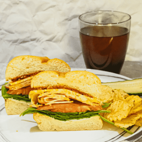 - Cut in half. Serve with pickles and chips.
