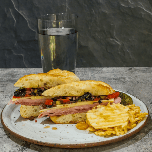 - To serve: Cut muffuletta in half and enjoy with chips, pickle, and sparkling water.