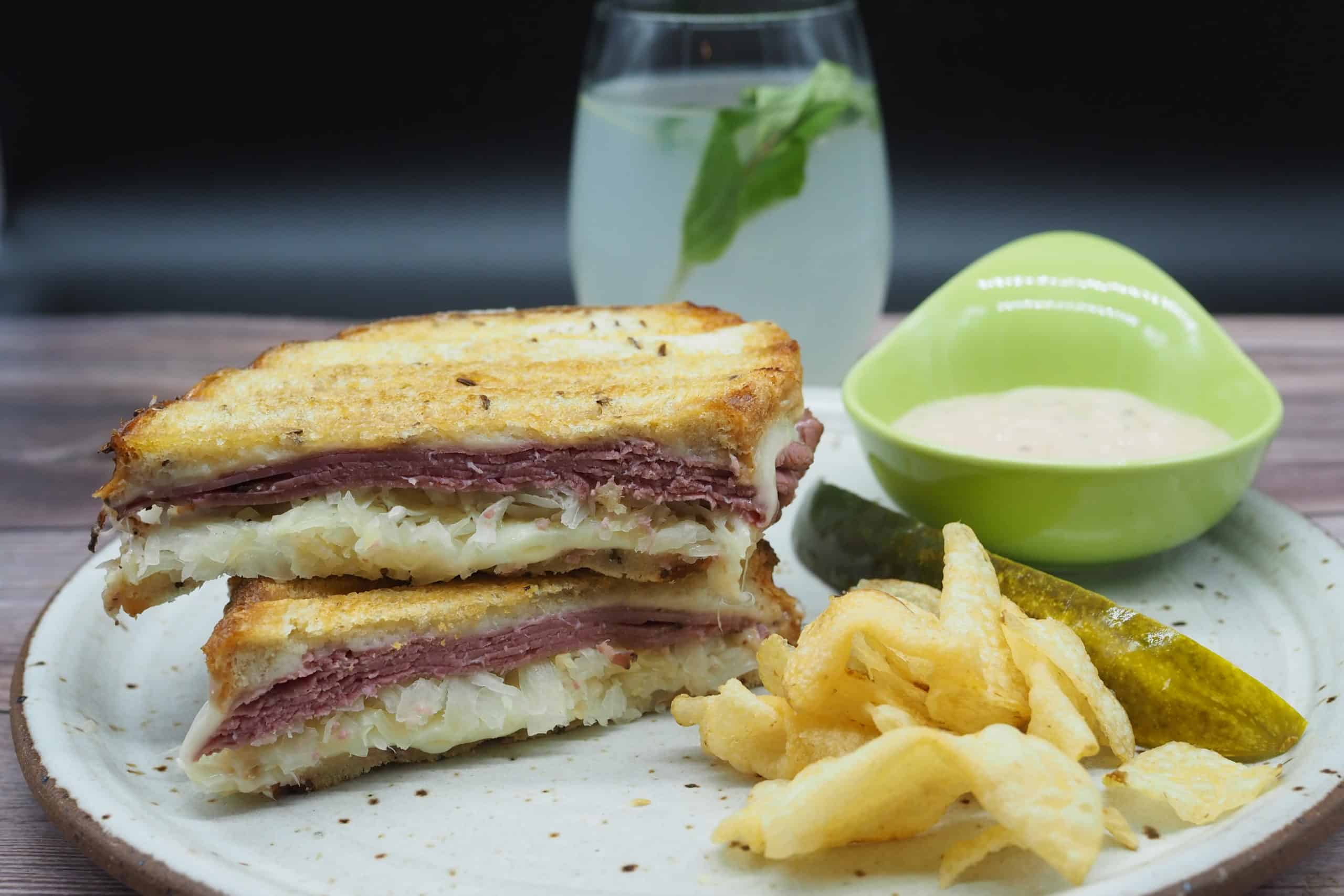 - To build the sandwich: place a slice of cheese on a slice of bread, followed by sauerkraut, pastrami, another slice of cheese and slice of bread. Repeat for other portions if necessary.